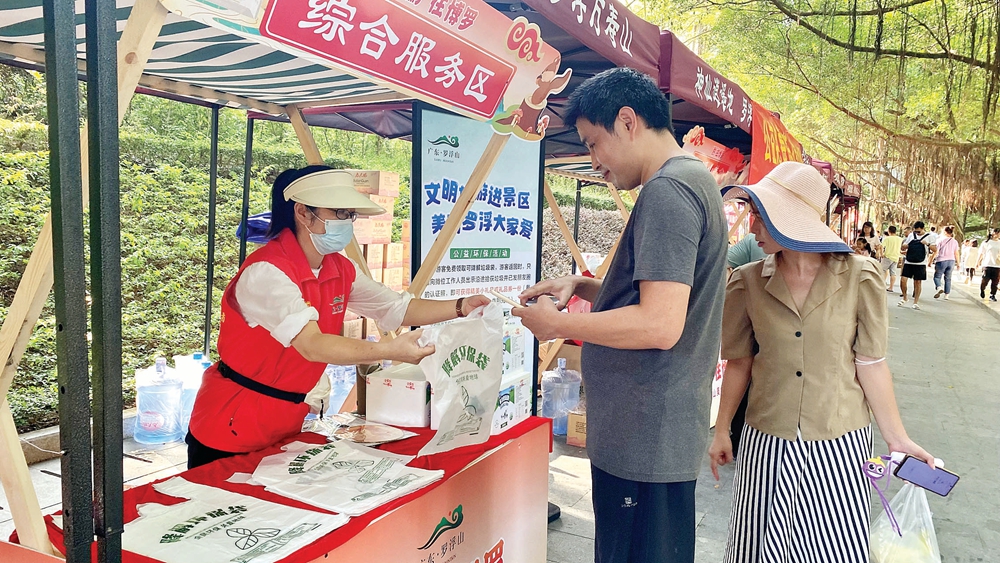 在羅浮山景區(qū),志愿者向游客宣傳文明旅游。