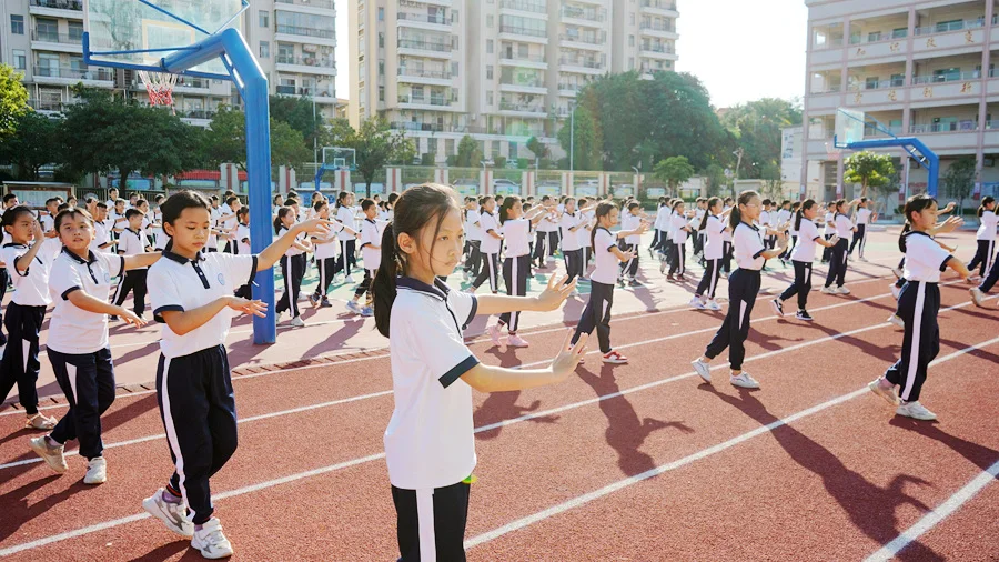 “少兒粵韻操,現(xiàn)在開始!”隨著校園廣播的響起,園洲中心小學的孩子們在操場上排列整齊,隨著音樂的韻律舞動起來。