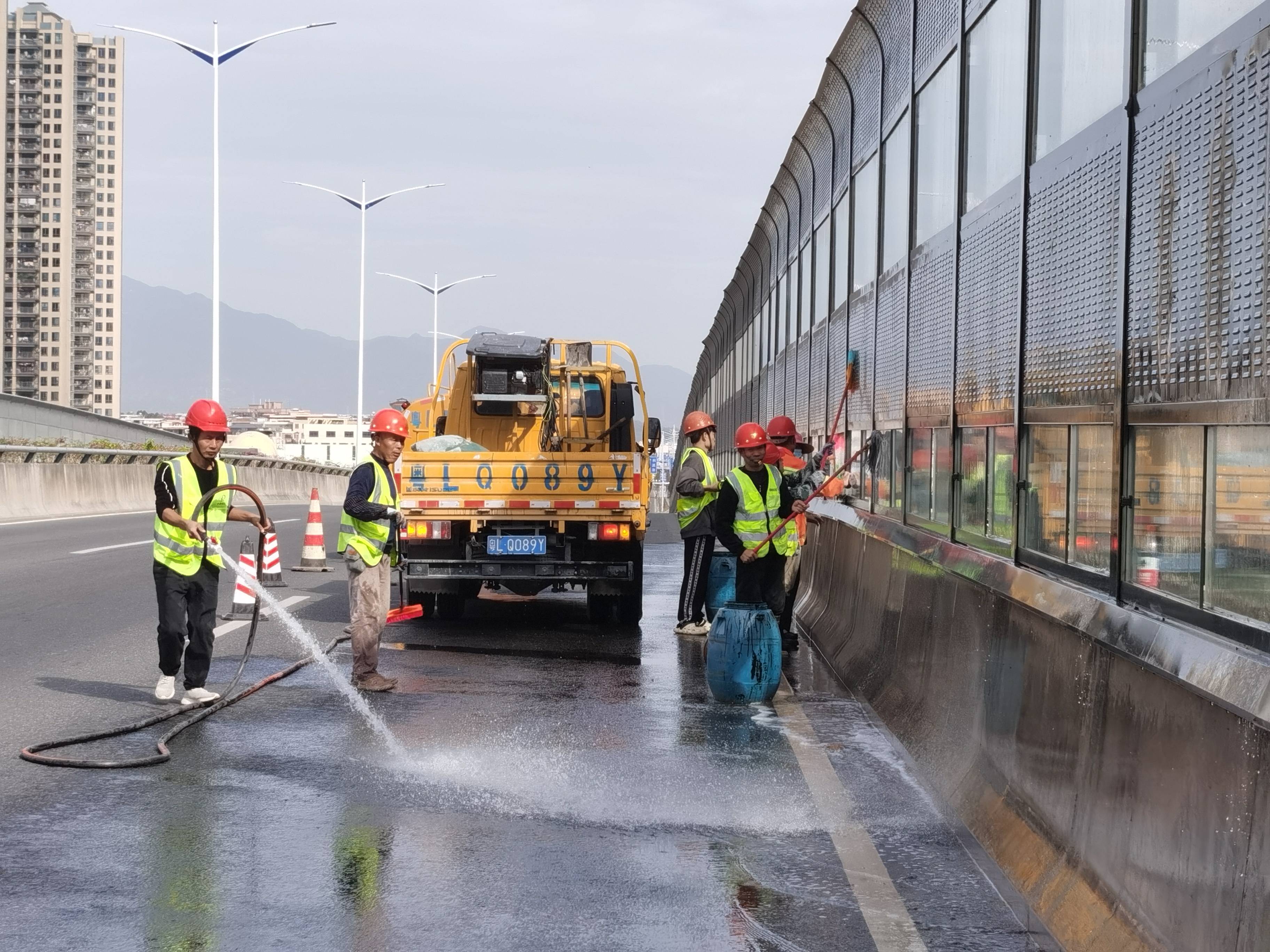 作業(yè)人員在金龍大道市區(qū)段跨線橋上清洗隔音屏。惠州日?qǐng)?bào)記者鐘暢新 攝