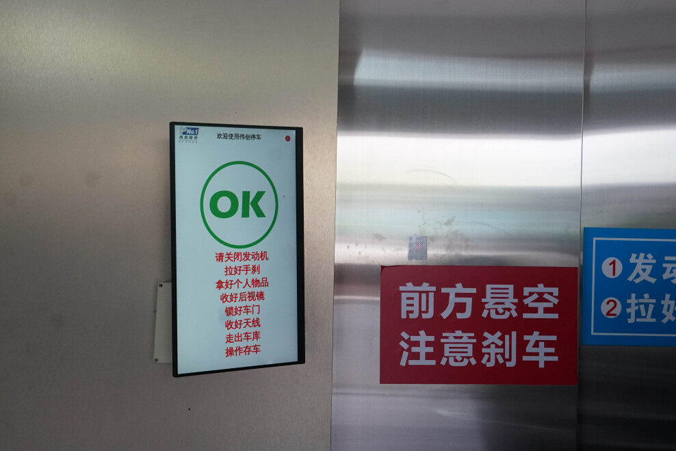 4月12日上午9時許,記者駕車來到花邊嶺智慧停車場體驗,將車頭對準車庫門后,不久車庫門便徐徐開啟,然后將車輛開進預(yù)定軌道即可,車庫內(nèi)正前方還設(shè)置了一面落地鏡,以方便車主對照順利進入軌道內(nèi),按照指引操作,一般不會發(fā)生剮蹭等現(xiàn)象。車輛停好后,車頭左側(cè)顯示屏會自動提醒車主關(guān)閉發(fā)動機、拉好手剎、收好后視鏡等。