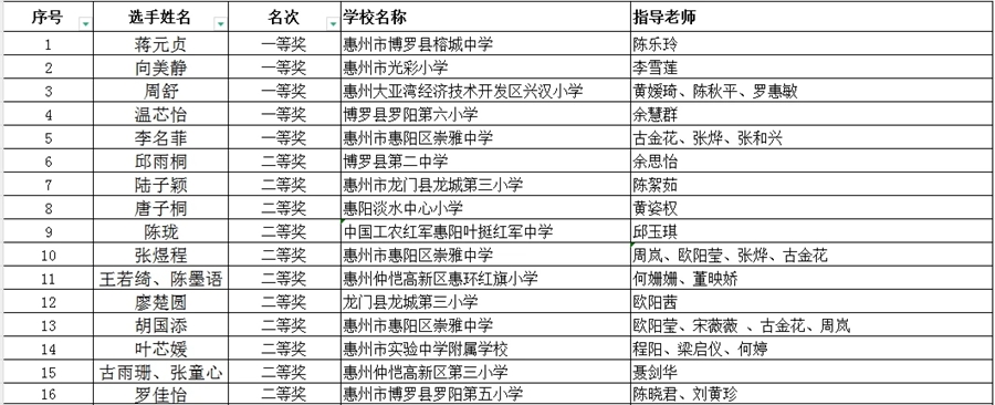 經(jīng)過激烈角逐,蔣元貞、向美靜、周舒、溫芯怡、李名菲5名選手獲一等獎,邱雨桐、陸子穎、唐子桐等選手獲二等獎,曹志恒、蘇莉娟、楊易程等選手獲三等獎。此次活動還對“優(yōu)秀組織單位”“優(yōu)秀指導(dǎo)老師”進行評選并頒發(fā)證書。