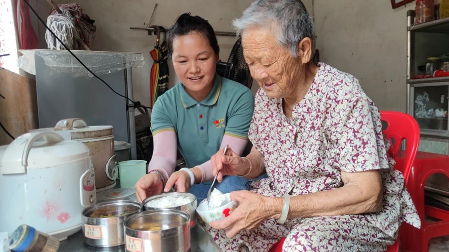 仲愷雨花公益互助會(huì)會(huì)長(zhǎng)朱慧莉(左)在入戶送餐的同時(shí),也會(huì)多陪伴長(zhǎng)者。