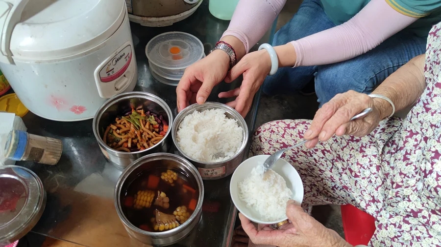 中午11時(shí)許,送餐志愿者劉麗敏剛把飯放下來(lái),就發(fā)現(xiàn)93歲的徐奶奶滿身大汗,于是幫她換衣服,打開(kāi)風(fēng)扇,然后擰開(kāi)不銹鋼飯盒蓋,把湯盛到碗里。