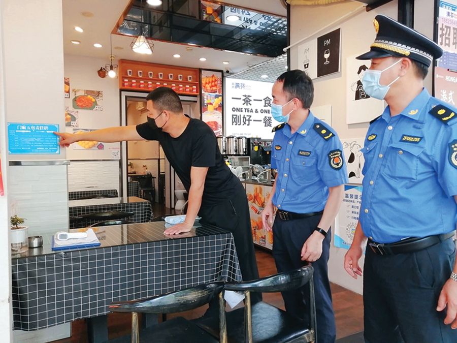 城管執(zhí)法人員在檢查市區(qū)臨街商鋪“門前五包”責(zé)任制落實(shí)情況。