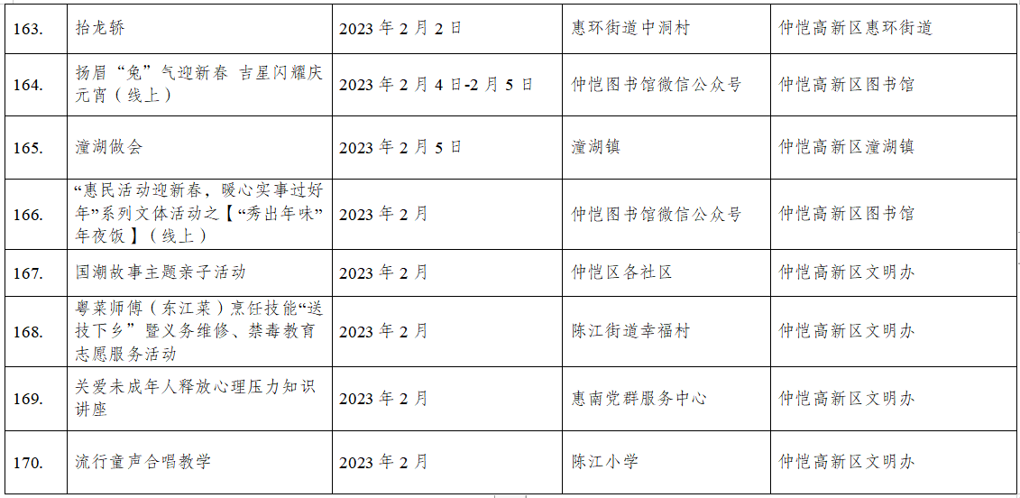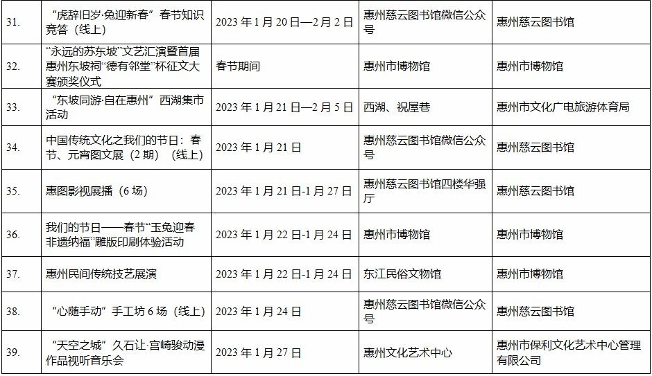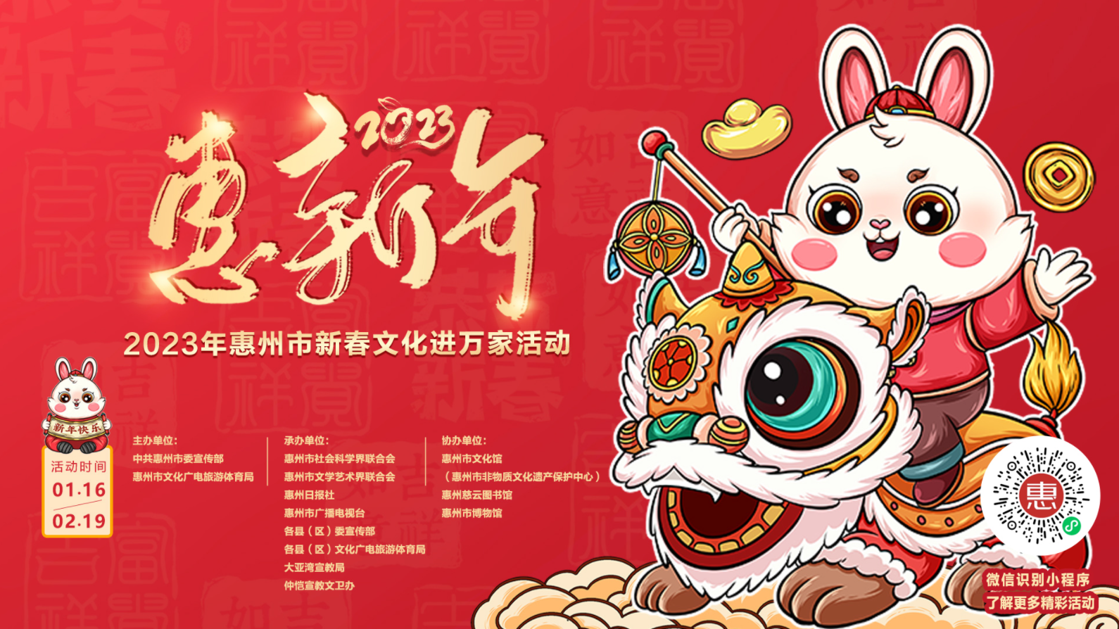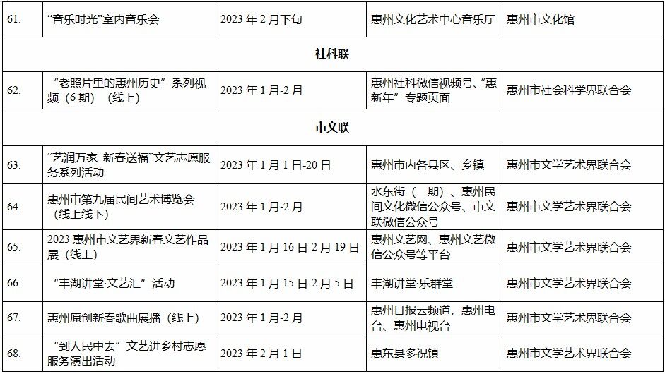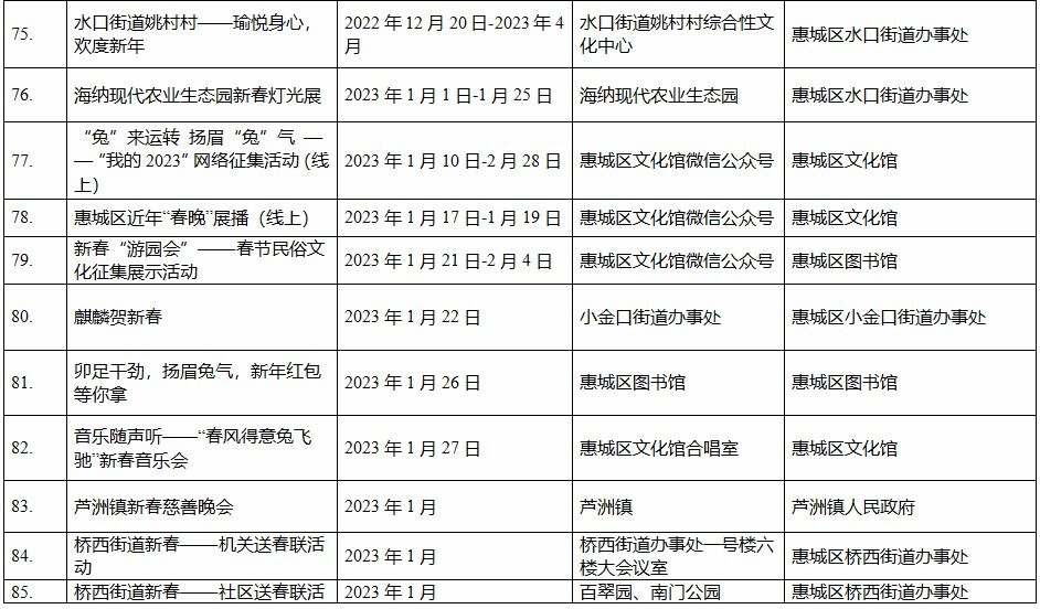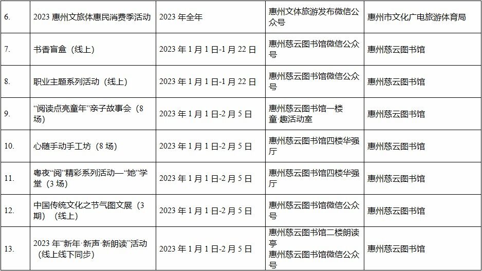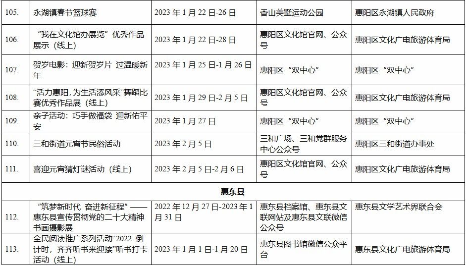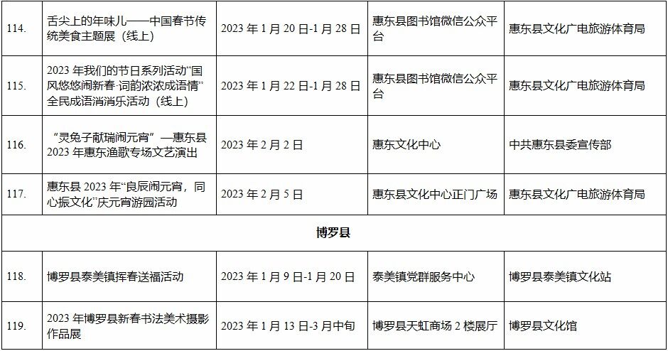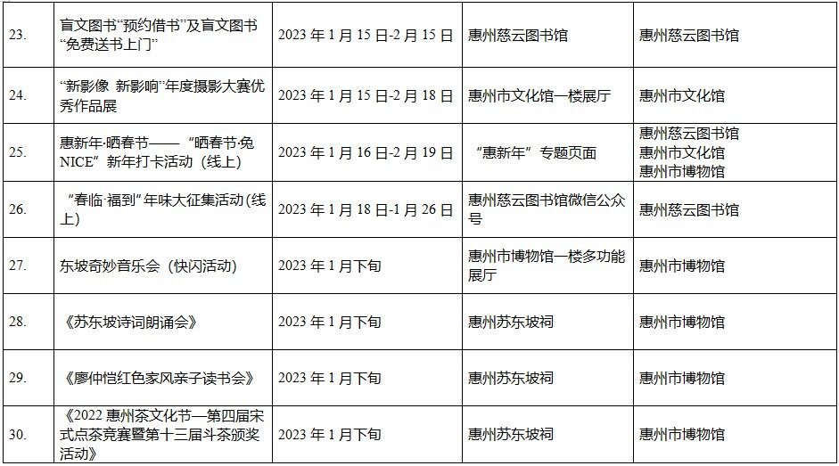 到各大公共文化場(chǎng)館打卡、參加線上線下各類文化活動(dòng)、感受傳統(tǒng)中國(guó)年味、云上賞戲劇……1月15日,記者從市委宣傳部獲悉,“惠新年”——2023年惠州市新春文化進(jìn)萬(wàn)家活動(dòng)將于1月16日全面啟動(dòng)。活動(dòng)將持續(xù)到2月19日,覆蓋整個(gè)農(nóng)歷新年,惠州市委宣傳部將統(tǒng)籌組織各縣(區(qū))、市直宣傳文化單位力量,開展逾170場(chǎng)主題線上線下活動(dòng),進(jìn)一步營(yíng)造喜慶、團(tuán)結(jié)、祥和的節(jié)慶氛圍,讓廣大市民游客在惠過(guò)年游得舒心、玩得盡興。