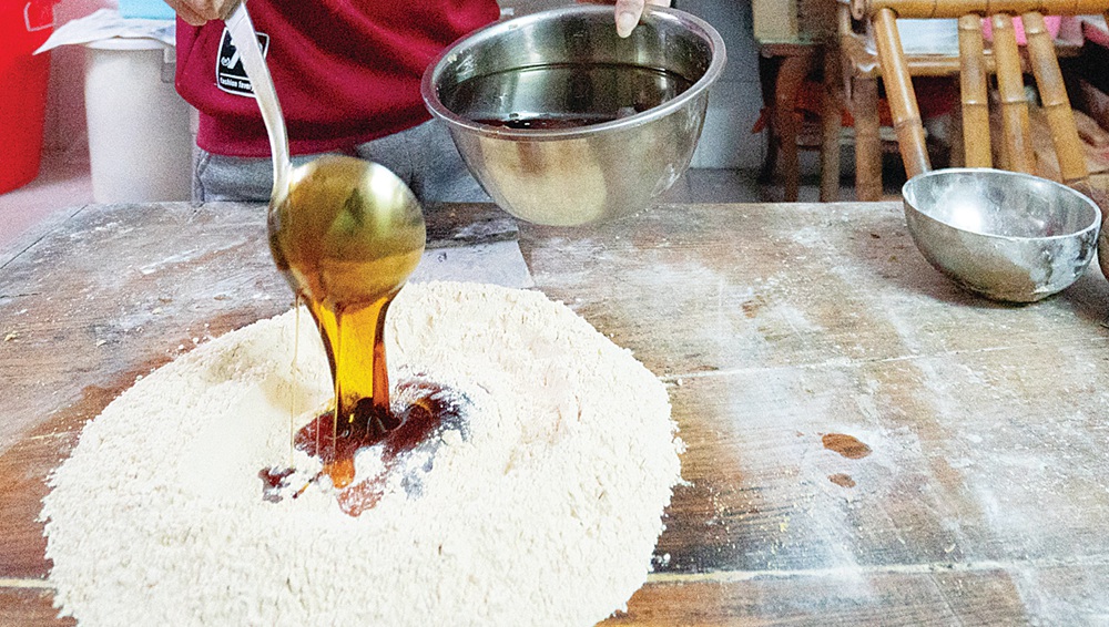 米粉與糖漿充分?jǐn)嚢琛?/font>