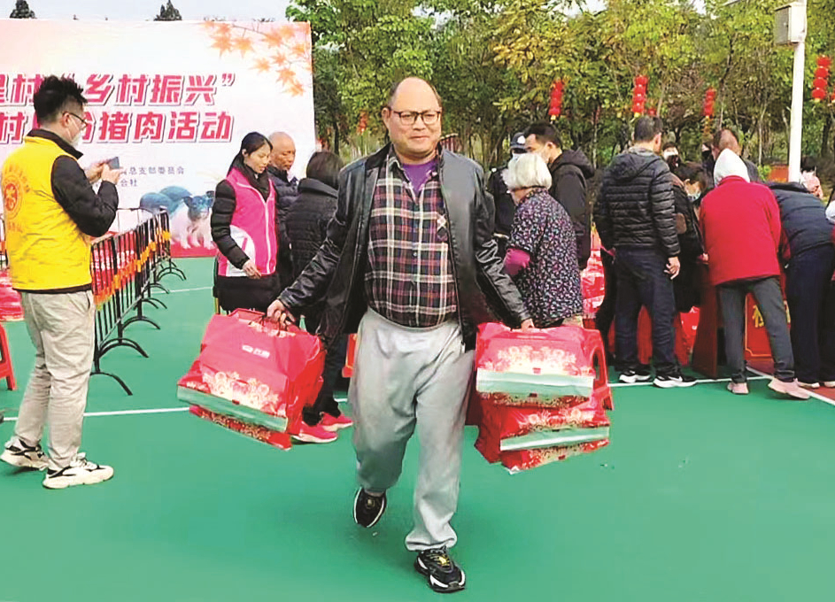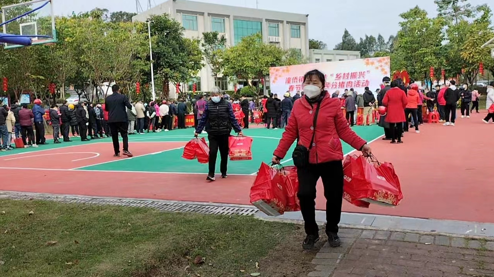 籃球場上,潼僑鎮(zhèn)金星村“鄉(xiāng)村振興”春節(jié)聯(lián)歡村民分豬肉活動的主題背板特別喜慶。上午9時40分,一輛白色冷藏車緩緩駛?cè)耄诮鹦谴寤@球場旁邊停了下來。“快來人呀,過來幫忙搬豬肉。”隨即,不管是村干部、村民,還是孩子,大家齊上陣,將一袋袋分裝好的豬肉搬到籃球場上擺放整齊。