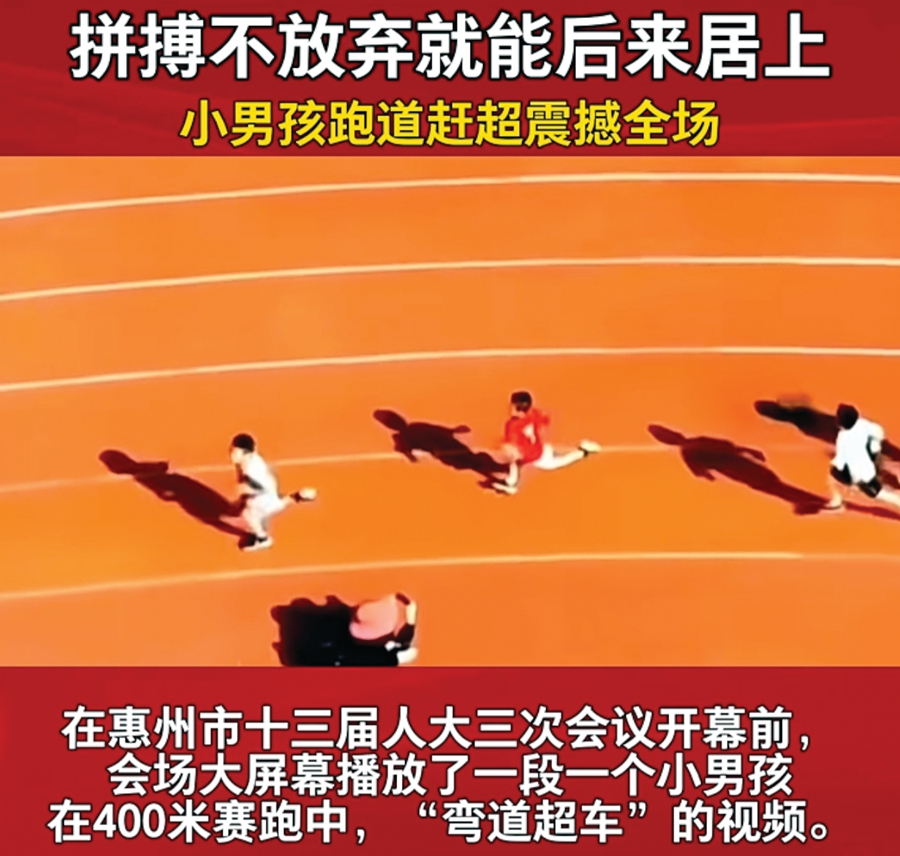 在市十三屆人大三次會議開幕前,會場大屏幕播放了一個小男孩在一次賽跑中“彎道超車”的視頻。 視頻截圖