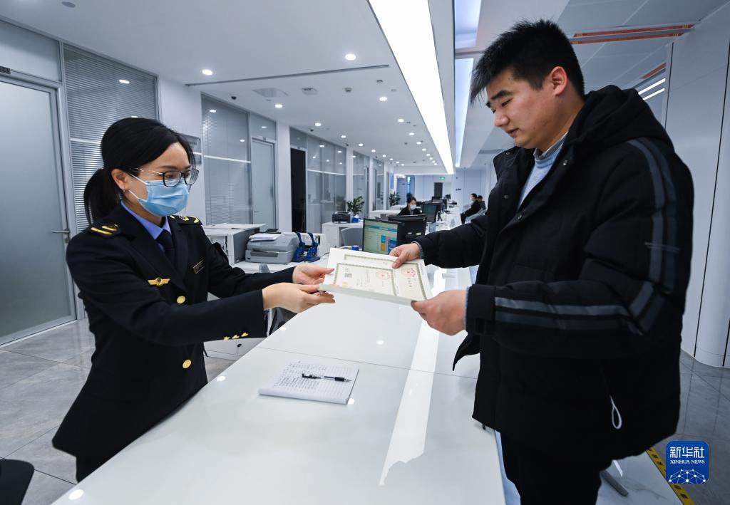 企業(yè)負(fù)責(zé)人在浙江省湖州市吳興區(qū)的中小微企業(yè)一站式服務(wù)平臺(tái)領(lǐng)取營(yíng)業(yè)執(zhí)照(2023年2月8日攝)。新華社記者 徐昱 攝