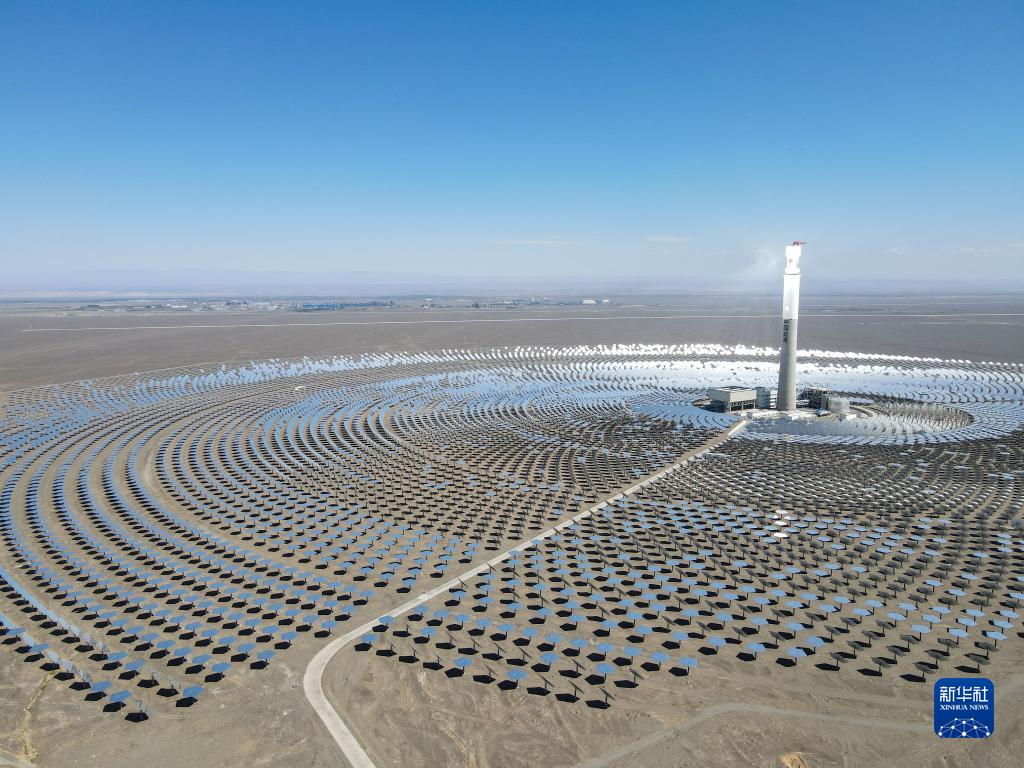 2021年8月22日拍攝的新疆伊吾縣淖毛湖鎮(zhèn)的哈密50兆瓦熔鹽塔式光熱發(fā)電站(無人機(jī)照片)。新華社記者 高晗 攝