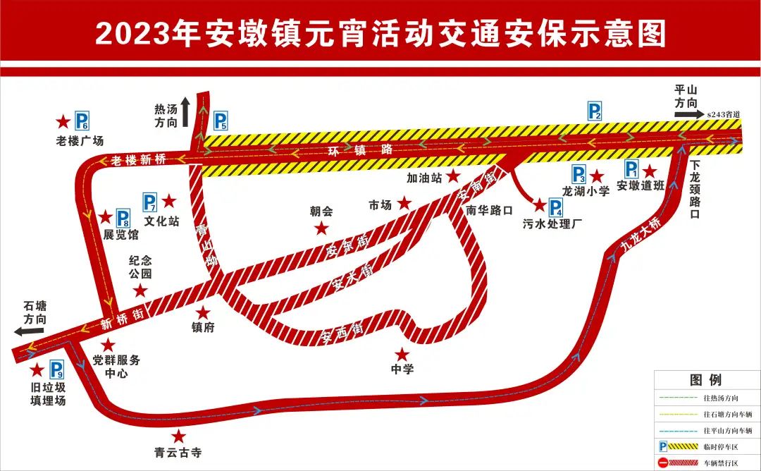 3.石塘、藍塘、紫金方向途徑S243線安墩圩鎮(zhèn)前往白盆珠、多祝、平山的車輛繞行路線:S243線→黨群服務(wù)中心→青云古寺→安墩南華橋→南華路→九龍大橋→龍頸村道→下龍頸路口→白盆珠、多祝、平山。