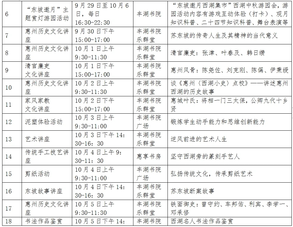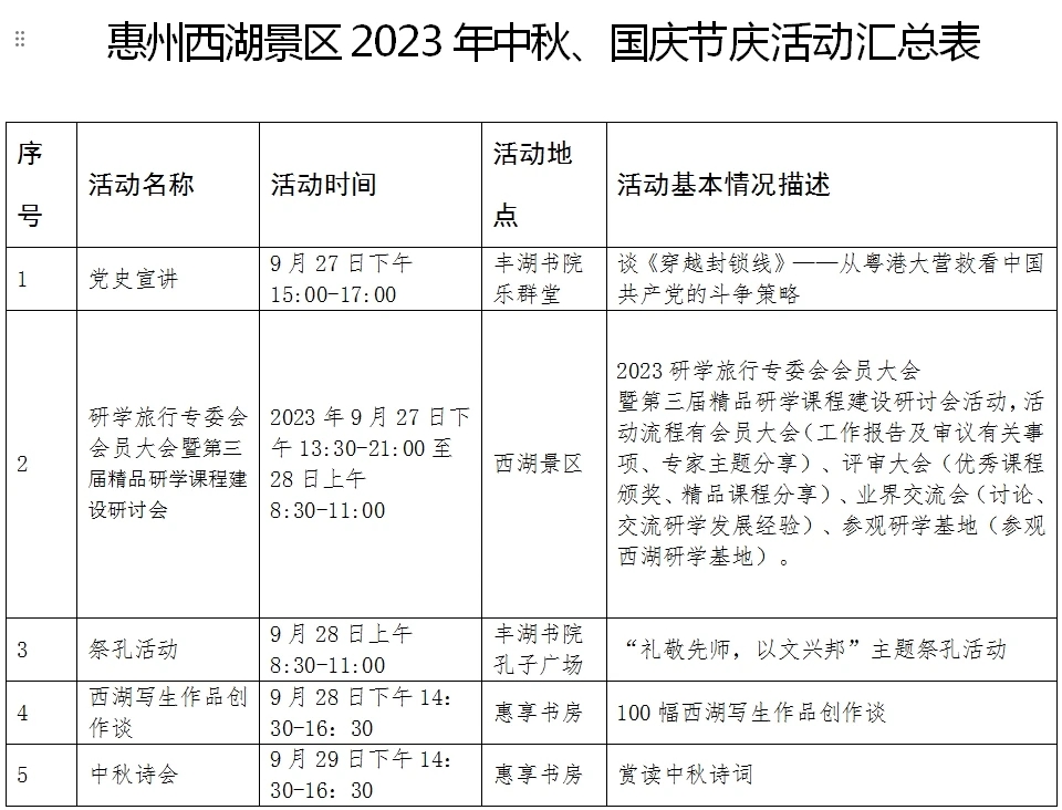 中秋、國(guó)慶即將來(lái)臨,惠州日?qǐng)?bào)記者從惠州西湖景區(qū)管理中心獲悉,西湖景區(qū)在中秋、國(guó)慶節(jié)期間,將舉辦多種形式的活動(dòng),包括黨史宣講、精品研學(xué)課程建設(shè)研討會(huì)、祭孔活動(dòng)、寫生作品創(chuàng)作談、中秋詩(shī)會(huì)、賞燈游園活動(dòng)、各類講座、剪紙活動(dòng)、古箏演奏等等。歡迎感興趣的市民群眾前往參加。