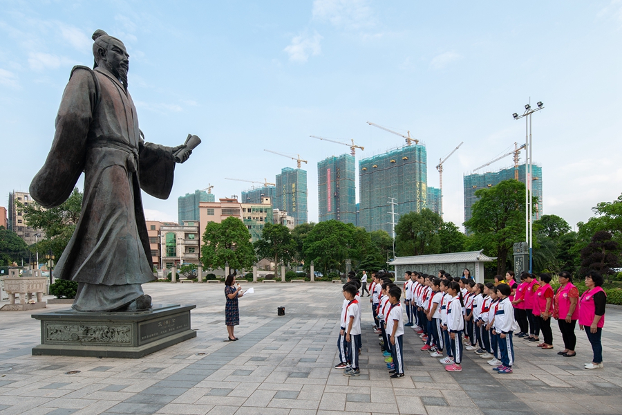 沿著平整的柏油路來到西區(qū)街道塘尾村,巨大的朱熹雕塑、中國傳統(tǒng)《中華二十四孝》碑林立于朱子文化廣場。朱熹的《觀書有感》被制作成石雕擺放在文德庭天井內(nèi)。塘尾村是宋代理學家、思想家朱熹后人聚居地,迄今已有300多年的歷史。