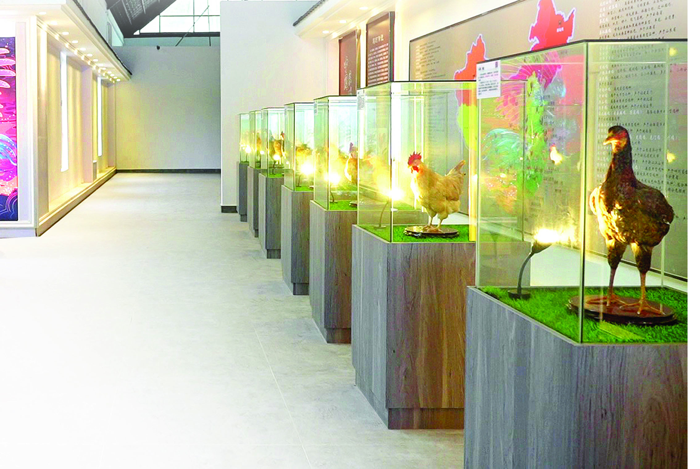 博物館分3個(gè)展廳,通過展板、文物、標(biāo)本、實(shí)物、書畫作品等形式,展示了雞的品種形成,養(yǎng)雞業(yè)的發(fā)展變遷歷史、發(fā)展趨勢(shì),世界主要雞種的分布、我國(guó)雞種分布以及主要雞種的外觀特點(diǎn)、性狀性能。