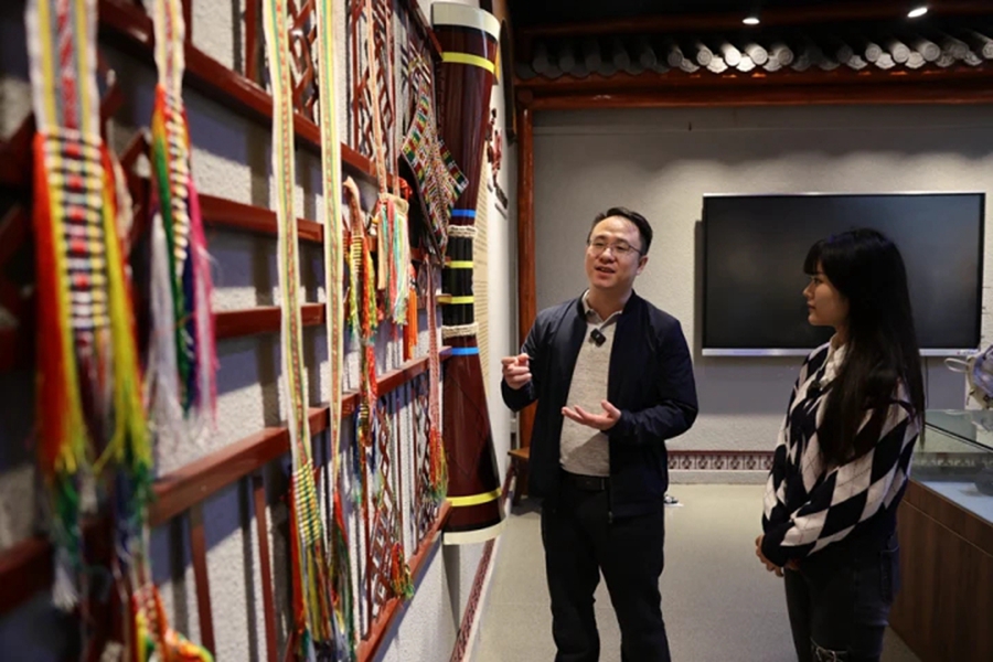 駐藍(lán)田瑤族鄉(xiāng)幫鎮(zhèn)扶村工作隊(duì)隊(duì)長(zhǎng)邱歡正在向記者介紹藍(lán)田瑤族鄉(xiāng)文化展覽館內(nèi)陳列的各類(lèi)展覽品。