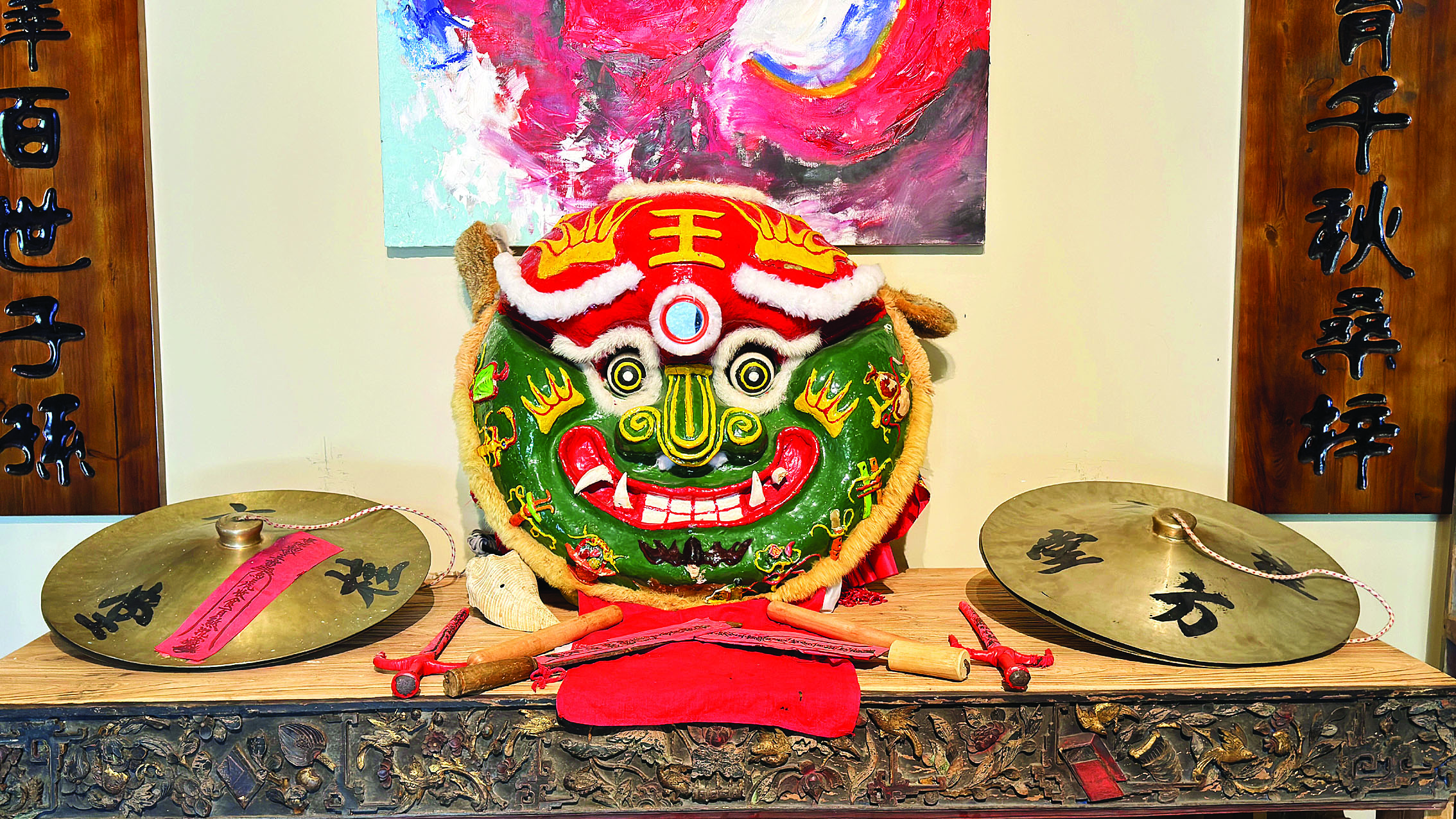 溪美村史館最讓村民津津樂(lè)道的當(dāng)屬“鎮(zhèn)館之寶”蓋子獅。只見(jiàn)蓋子獅頭部狀似鍋蓋,紅額青面、口闊、目大、鼻短,面額正中寫(xiě)有“王”字。據(jù)悉,溪美村蓋子獅源于清代,是鐵涌方氏族人的傳統(tǒng)舞蹈,由方氏先祖口傳身授,流傳至今。每逢年節(jié)、婚姻嫁娶、新居落成等慶典活動(dòng),當(dāng)?shù)孛癖姸紩?huì)舞獅祈求風(fēng)調(diào)雨順、國(guó)泰民安、福祿長(zhǎng)壽。2018年,鐵涌蓋子獅(傳統(tǒng)舞蹈)被列入市級(jí)非物質(zhì)文化遺產(chǎn)名錄。2022年被列入省級(jí)非物質(zhì)文化遺產(chǎn)項(xiàng)目。