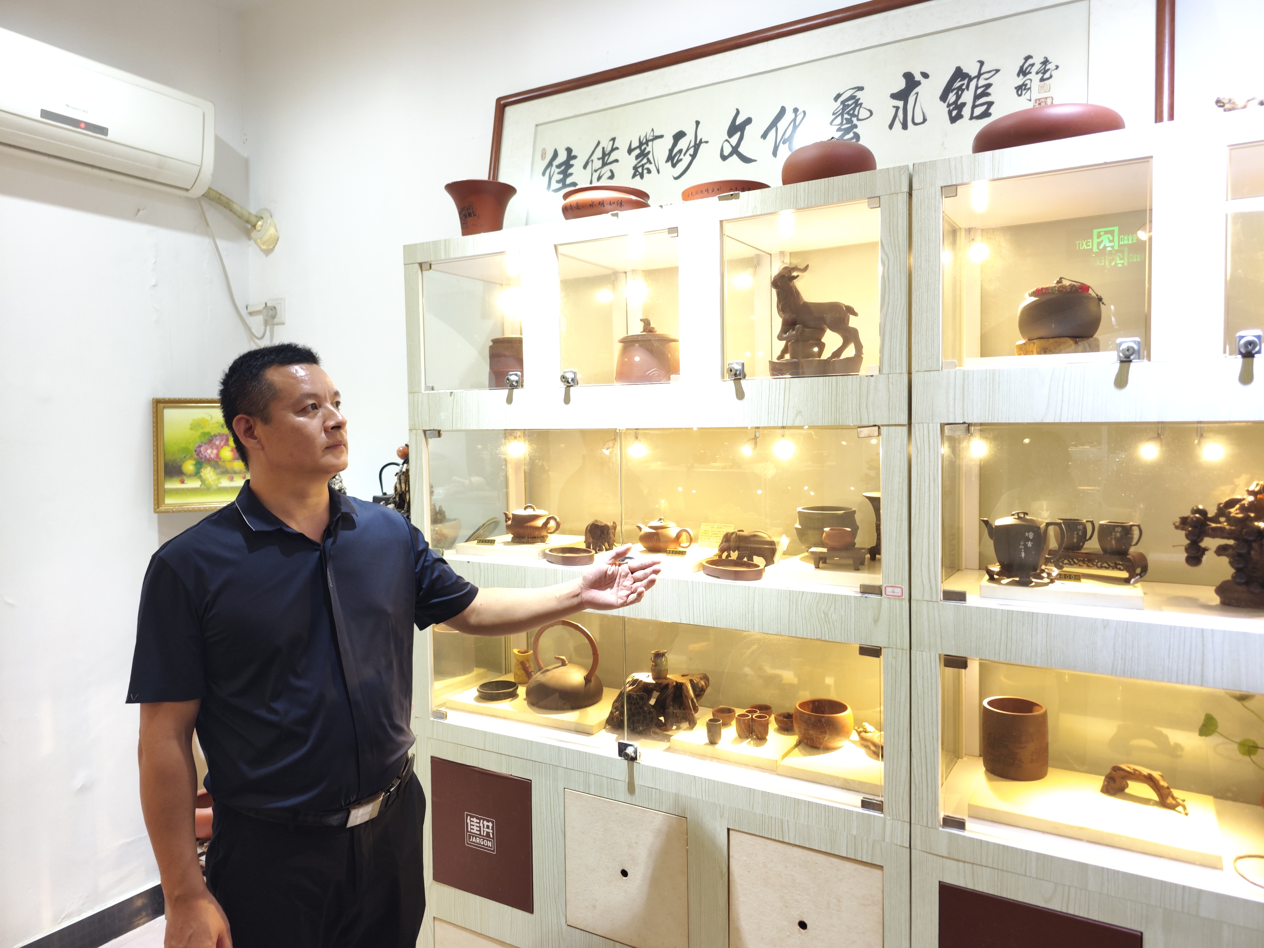 惠州市神怡紫砂藝術(shù)研究社社長陳旭在介紹紫砂展品。