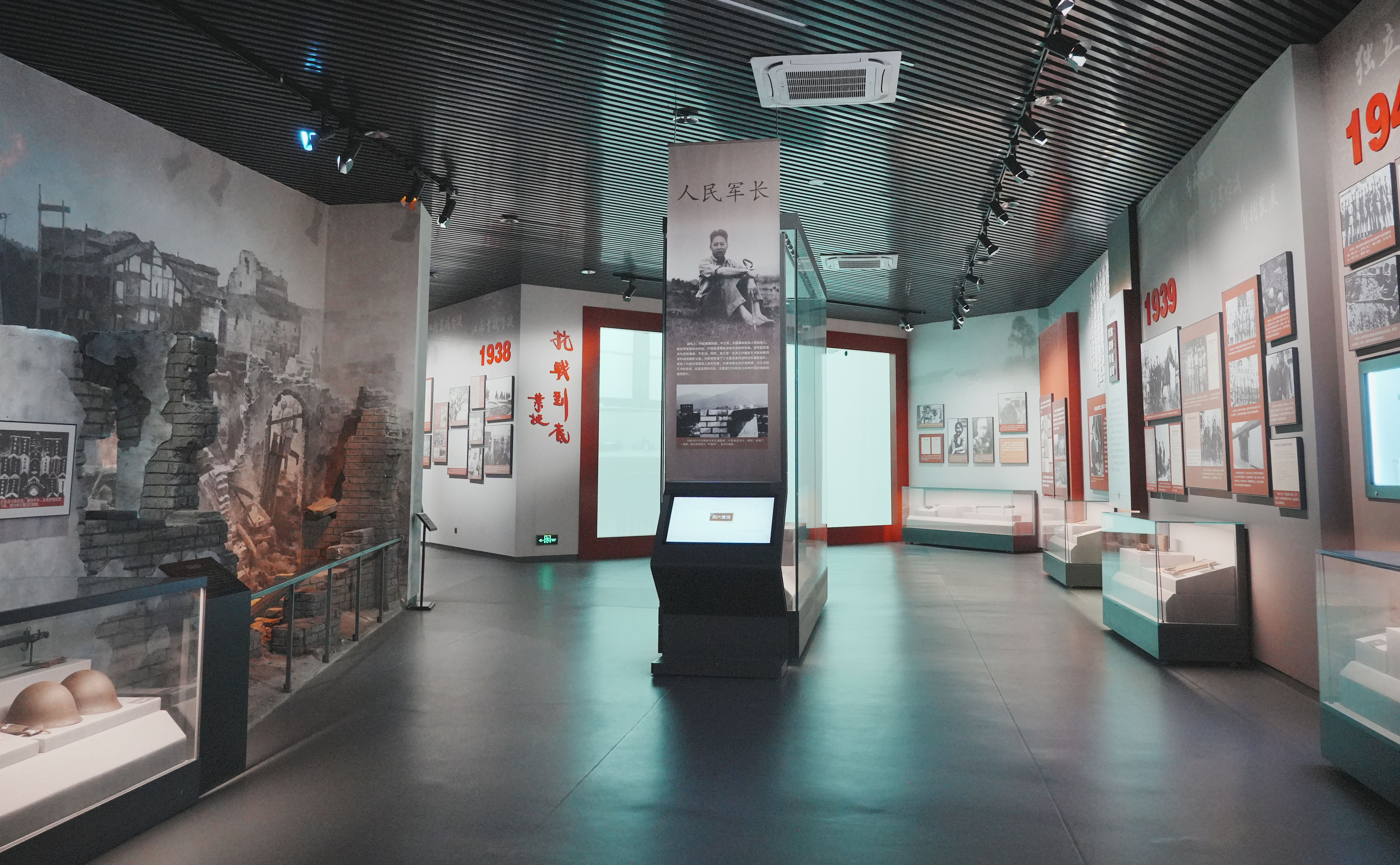第三部分采用了場(chǎng)景實(shí)景嵌入展版(醴陵)、步入式場(chǎng)景結(jié)合紗曼畫面(賀勝橋)、多媒體結(jié)合版面以及油畫輔助版面(陳可鈺報(bào)告)、展品獨(dú)立展位(手槍)、展品還原(盾牌)等方式反復(fù)渲染。