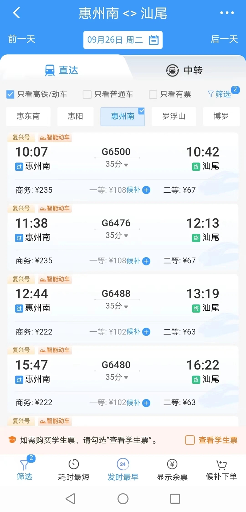 記者在中國鐵路12306網(wǎng)站(12306手機(jī)客戶端)查詢看到,9月26日惠州南至廣州東開行6趟動車,首趟車用時1小時2分,商務(wù)座281元,一等座129元,二等座88元;其余5趟車用時1小時1分,二等座從92元到102元不等。