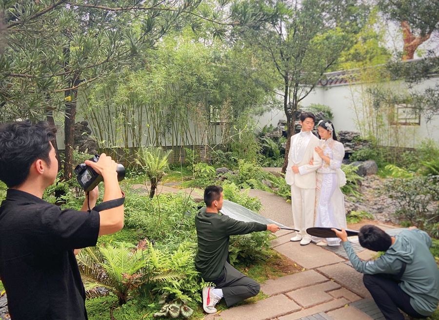 “這里場景豐富,北歐風(fēng)情、中式庭院、波希米亞風(fēng)格我都很喜歡,拍出意境。”新人小慧說,最初他們想旅拍婚紗照,受疫情影響沒有實現(xiàn),“在家門口就能拍出旅拍婚紗照,省去舟車勞頓和經(jīng)濟成本,很不錯。”
