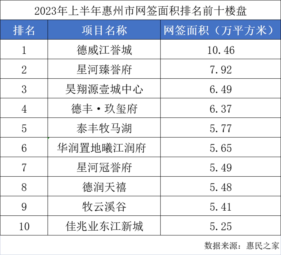 惠民之家數(shù)據(jù)研究中心公布數(shù)據(jù)顯示,2023年上半年惠州市網(wǎng)簽面積排名前十的樓盤(pán)分別是德威江譽(yù)城(10.46萬(wàn)㎡)、星河臻譽(yù)府(7.92萬(wàn)㎡)、昊翔源壹城中心(6.49萬(wàn)㎡)、德豐·玖璽府(6.37萬(wàn)㎡)、泰豐牧馬湖(5.77萬(wàn)㎡)、華潤(rùn)置地曦江潤(rùn)府(5.65萬(wàn)㎡)、星河冠譽(yù)府(5.49萬(wàn)㎡)、德潤(rùn)天禧(5.48萬(wàn)㎡)、牧云溪谷(5.41萬(wàn)㎡)、佳兆業(yè)東江新城(5.25萬(wàn)㎡)。