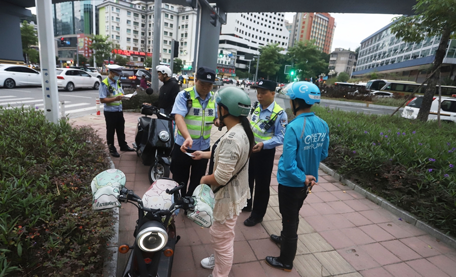 當(dāng)日下午5時(shí)許,記者在市區(qū)鵝嶺南路與鵝嶺西路交會(huì)路口發(fā)現(xiàn),一些“摩電”駕乘人員還是存在不戴安全頭盔、隨意變道、逆行等交通違法行為。不久,一輛電動(dòng)自行車沿鵝嶺西路由西往東行駛,駕乘人員因未佩戴安全頭盔被執(zhí)勤交警攔下進(jìn)行教育、處罰。“頭盔忘在家里了,下次一定注意。”駕駛員王先生認(rèn)為,駕駛摩托車、電動(dòng)自行車不戴安全頭盔,確實(shí)有一定的危險(xiǎn)性。