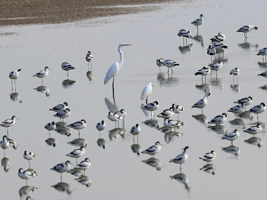 在西枝江邊與鷺鳥為伴的反嘴鷸。
