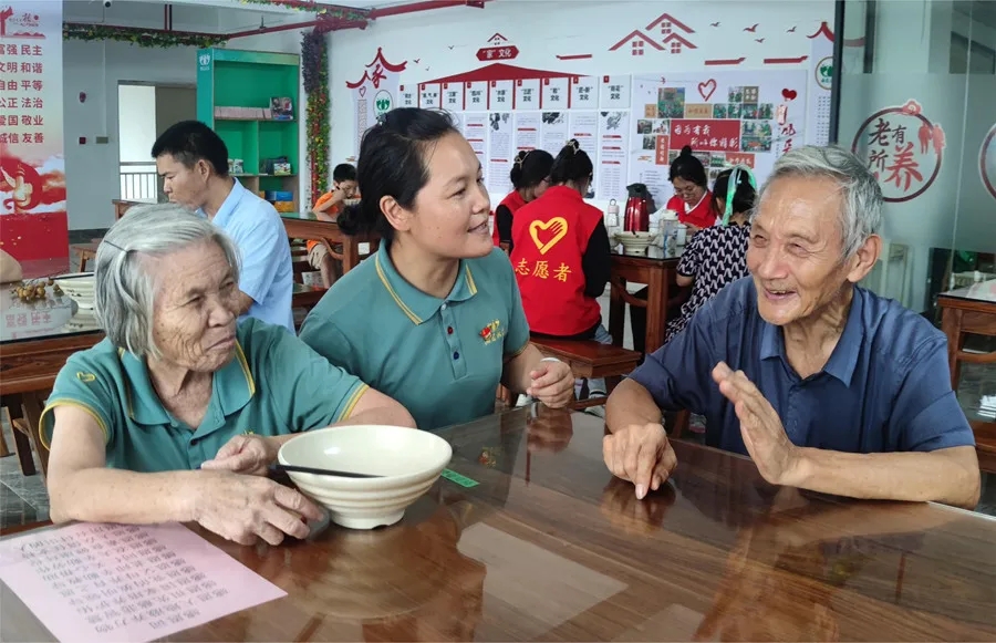 志愿者與到長(zhǎng)者飯?zhí)镁筒偷睦夏耆碎_心聊天。