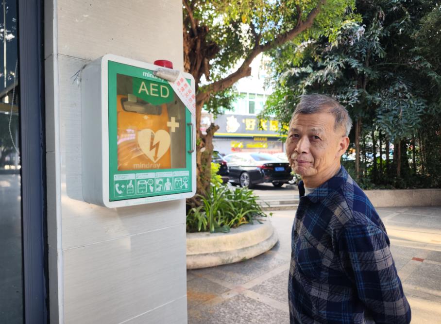 位于濱江公園特警執(zhí)勤室的AED,圖中的長者正在觀摩AED。
