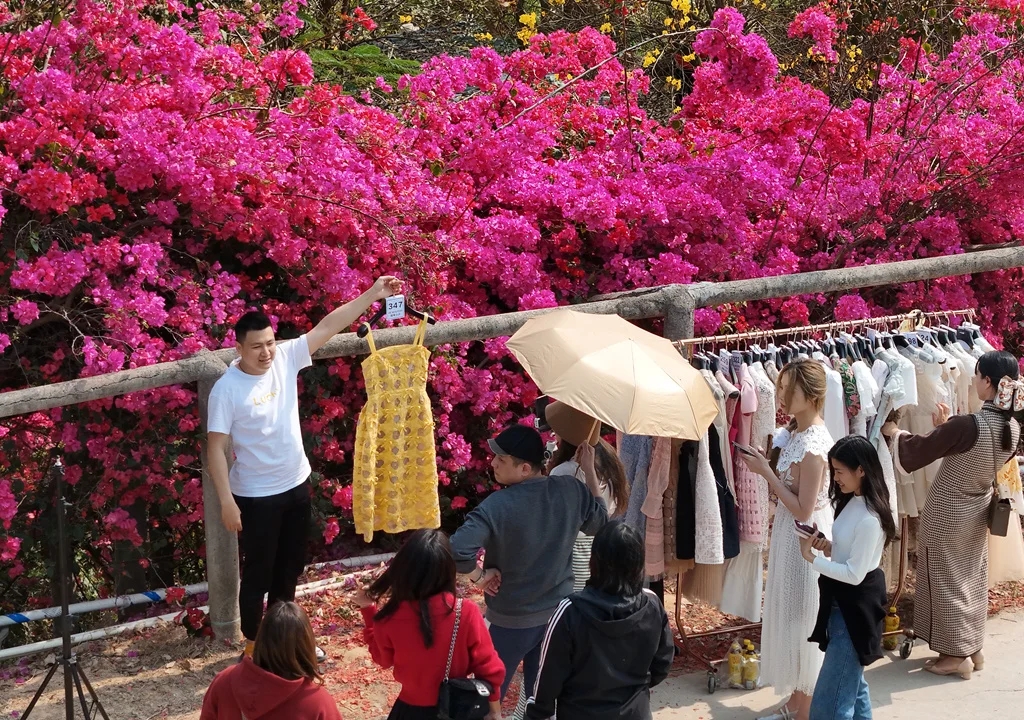 深圳某品牌服裝在三角梅花海前直播賣貨。