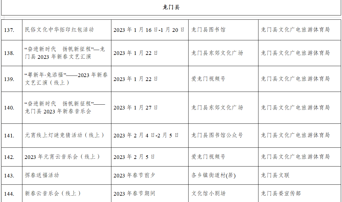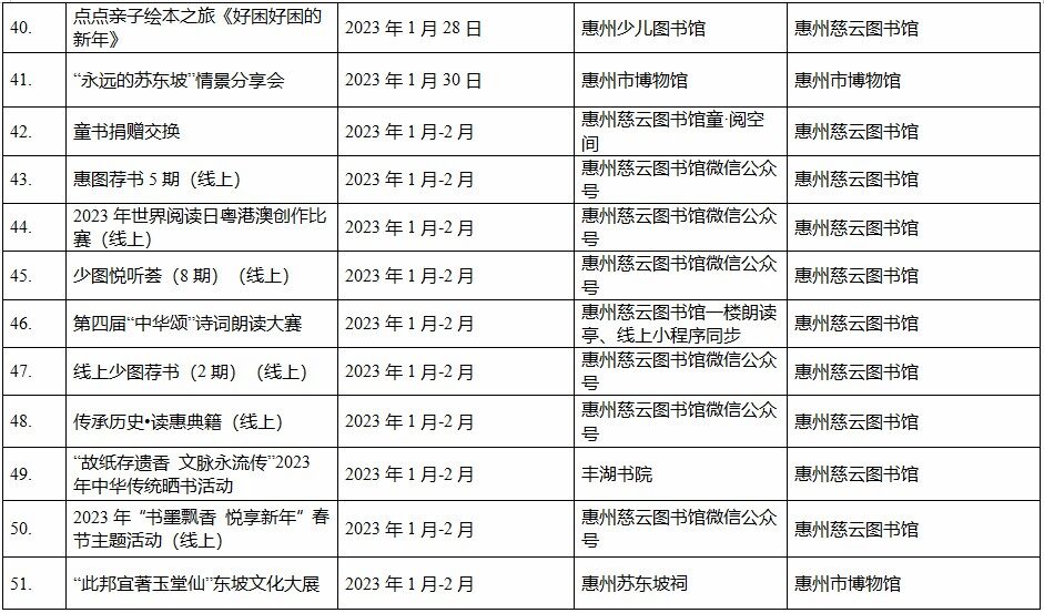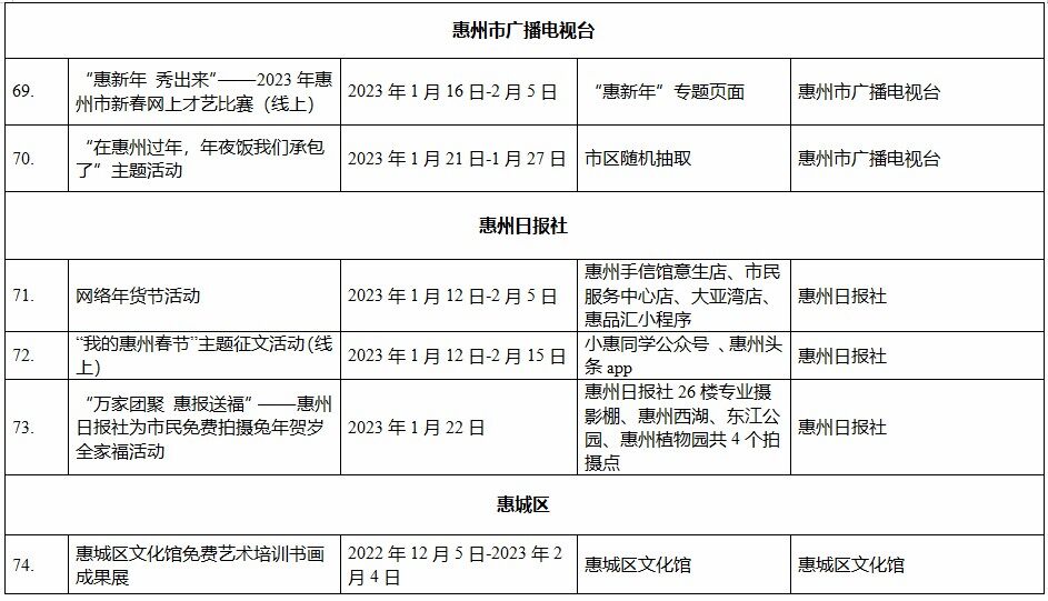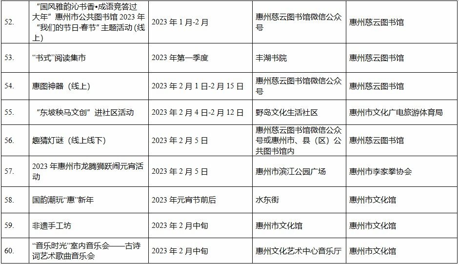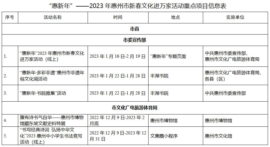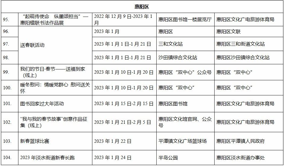 到各大公共文化場(chǎng)館打卡、參加線上線下各類文化活動(dòng)、感受傳統(tǒng)中國年味、云上賞戲劇……1月15日,記者從市委宣傳部獲悉,“惠新年”——2023年惠州市新春文化進(jìn)萬家活動(dòng)將于1月16日全面啟動(dòng)。活動(dòng)將持續(xù)到2月19日,覆蓋整個(gè)農(nóng)歷新年,惠州市委宣傳部將統(tǒng)籌組織各縣(區(qū))、市直宣傳文化單位力量,開展逾170場(chǎng)主題線上線下活動(dòng),進(jìn)一步營造喜慶、團(tuán)結(jié)、祥和的節(jié)慶氛圍,讓廣大市民游客在惠過年游得舒心、玩得盡興。