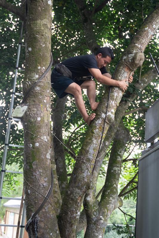 日前,剛走進(jìn)古欖園,記者便聽(tīng)到陣陣打?yàn)鯔炻暋9艡靾@里有208棵古欖樹(shù),大部分為烏欖,每棵欖樹(shù)的樹(shù)齡都超過(guò)了100年,枝繁葉茂,樹(shù)高接近或者超過(guò)10米,烏欖就結(jié)在高高的樹(shù)上。因此,打?yàn)鯔觳⒉皇且患资拢枰罉?shù)。
