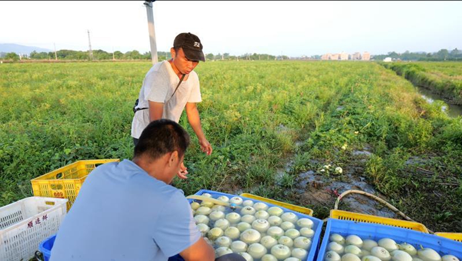 “你們隨便逛逛,先和村民們聊聊,上午時間緊,今天一個搞搬運的阿叔家里有事沒來,我先去忙一會兒。”匆匆和記者搭了個話,李院樂騎著三輪車在田間忙碌著將村民采收的一筐筐白香瓜轉(zhuǎn)運到集中清洗點。