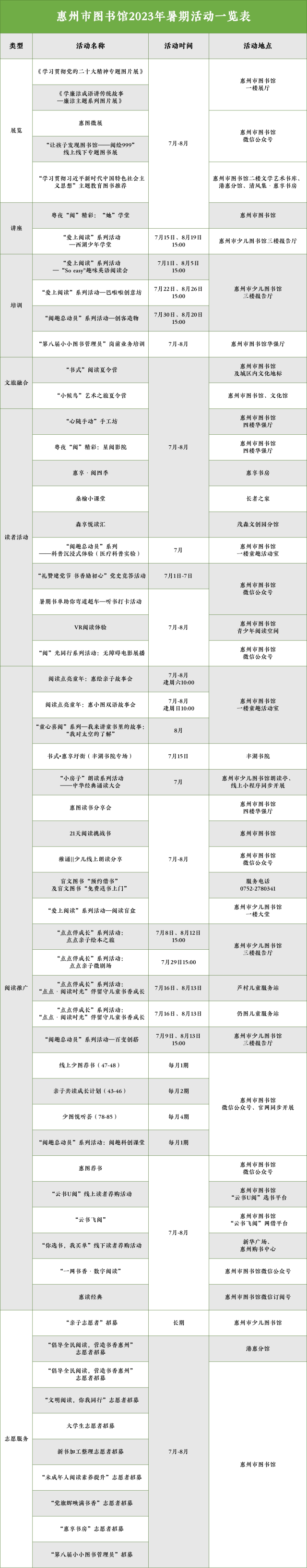 2023年暑假如期而至,為深入推進(jìn)全民閱讀工作,滿足讀者多元化的文化需求,惠州市圖書館將開啟暑期“炫閱模式”,精心準(zhǔn)備56項共170場閱讀推廣活動,靜待廣大市民過來品書香、覓清涼。