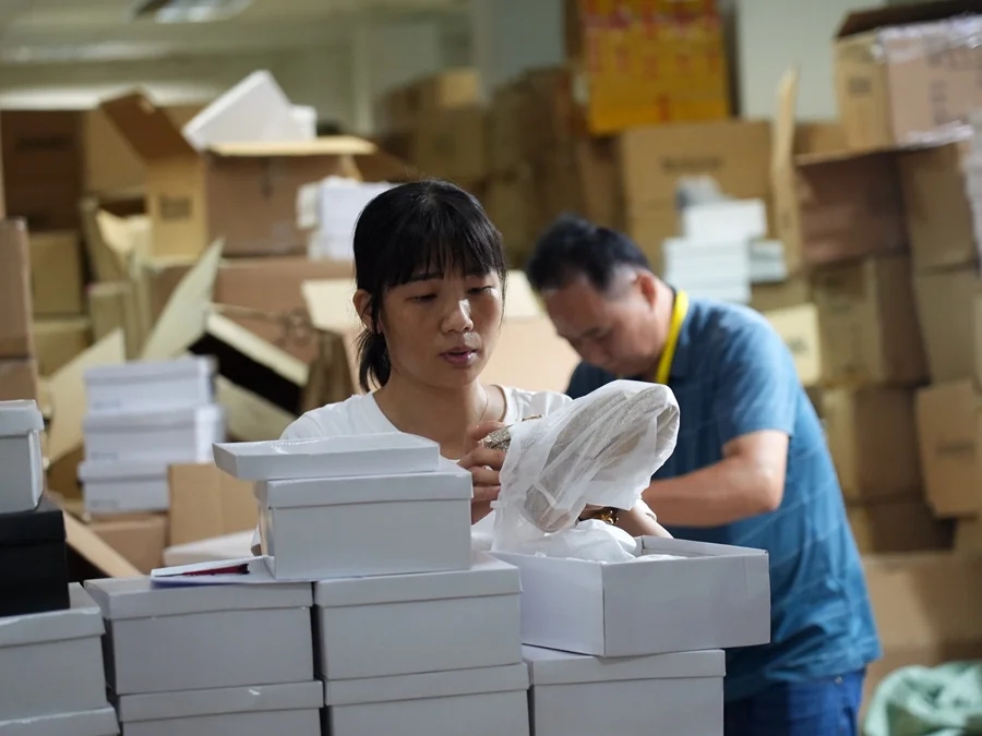 女鞋倉庫內(nèi),多名工作人員正忙著仔細(xì)檢查一雙雙女鞋,緊接著,工作人員操控電腦進行發(fā)貨。很快,這些女鞋就將搭乘跨境電商的“列車”奔赴全球各地。