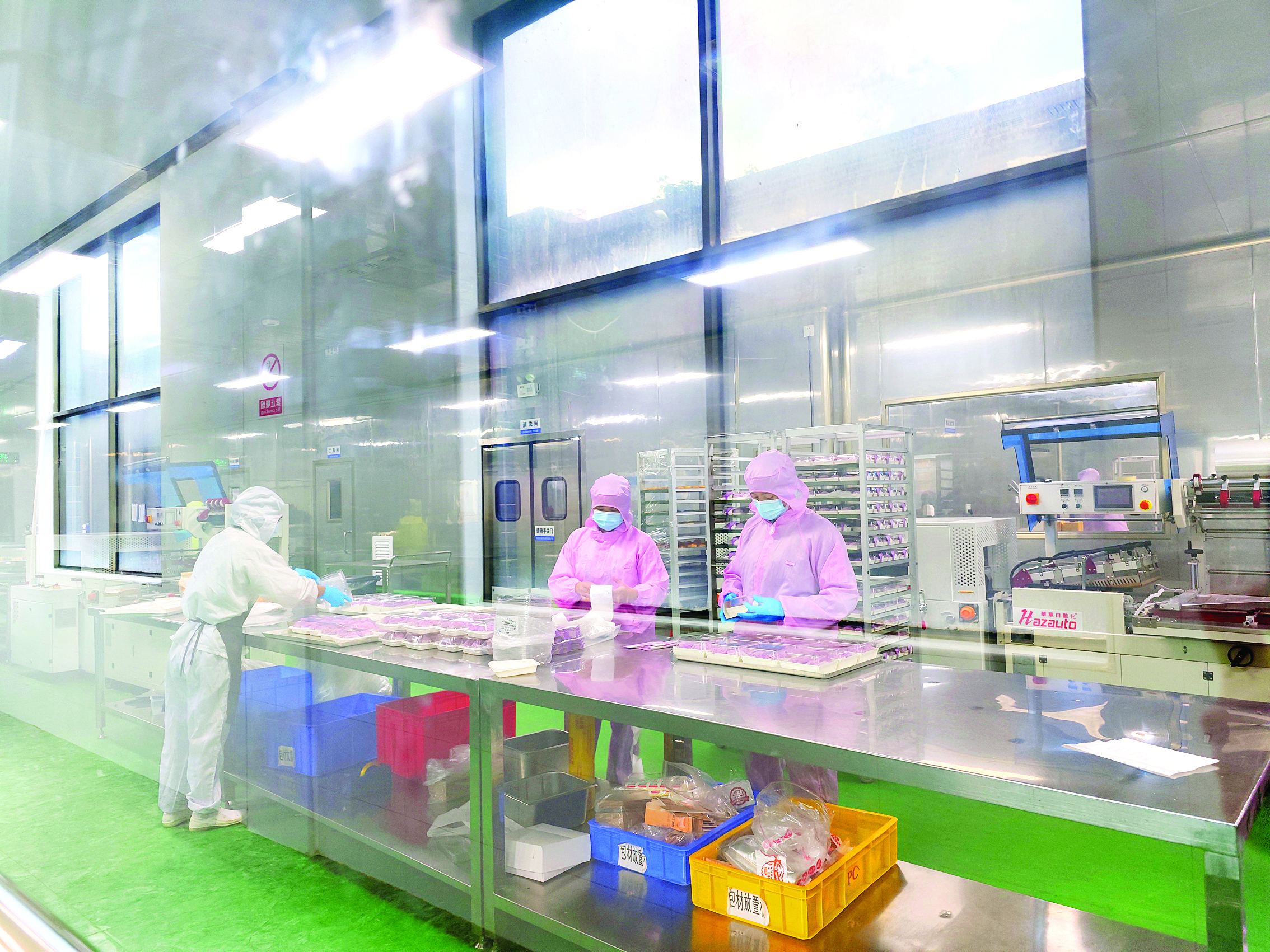 據(jù)介紹,鵬昌農(nóng)業(yè)利用先進生產(chǎn)設(shè)備,按照標準化和高質(zhì)量的要求進行生產(chǎn),滿產(chǎn)情況下,一天能生產(chǎn)10萬個面包。根據(jù)市場流行風(fēng)向,每隔一段時間開發(fā)新的產(chǎn)品。目前在預(yù)制菜領(lǐng)域,已開發(fā)400多種消費者喜聞樂見的產(chǎn)品,年產(chǎn)暢銷產(chǎn)品8000余噸。“現(xiàn)在我們還開發(fā)了加雞蛋的惠靈頓包、牛肉卷、芝士卷等,跟省外多家企業(yè)達成合作。”董平天說,不僅如此,公司還根據(jù)企業(yè)需求,推出了定制服務(wù),例如定制兔子、愛心、雞蛋形狀的慕斯、動畫聯(lián)名蛋糕、圣誕姜餅人等。
