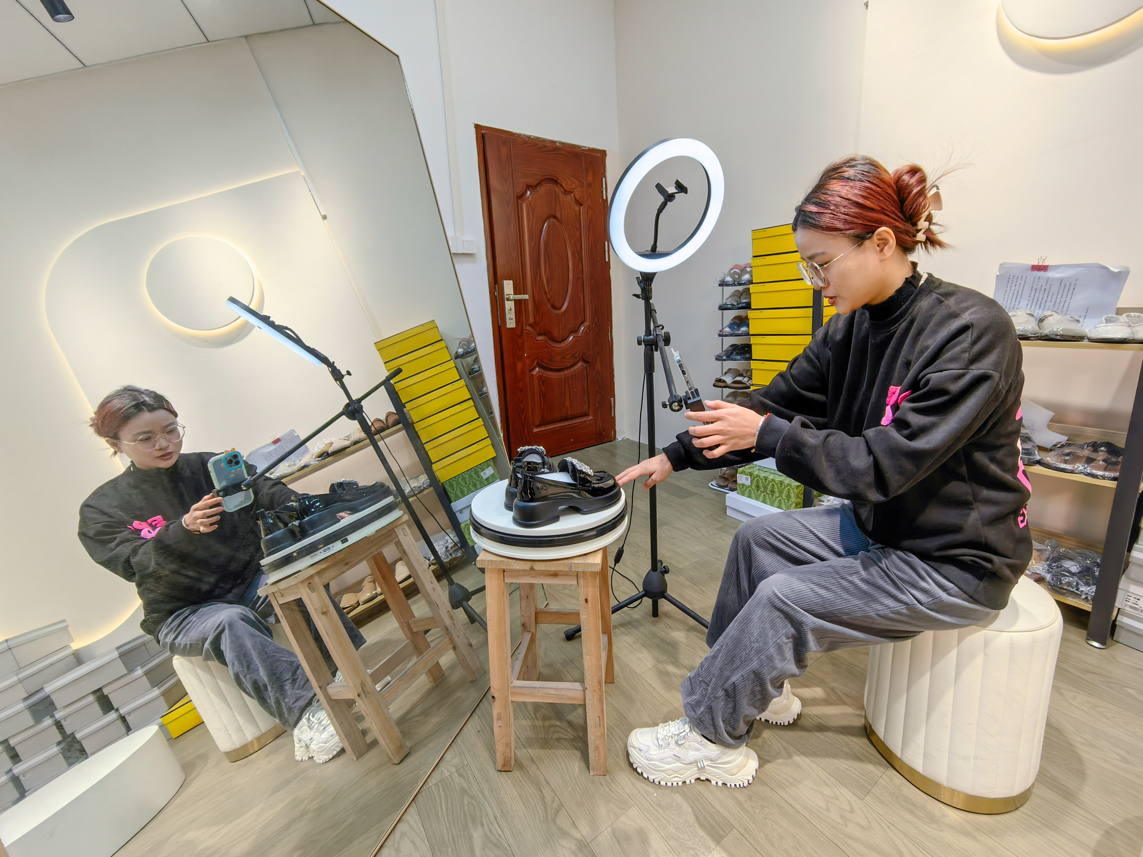 惠東女鞋企業(yè)工作人員直播帶貨。惠州日報記者陳濤 攝