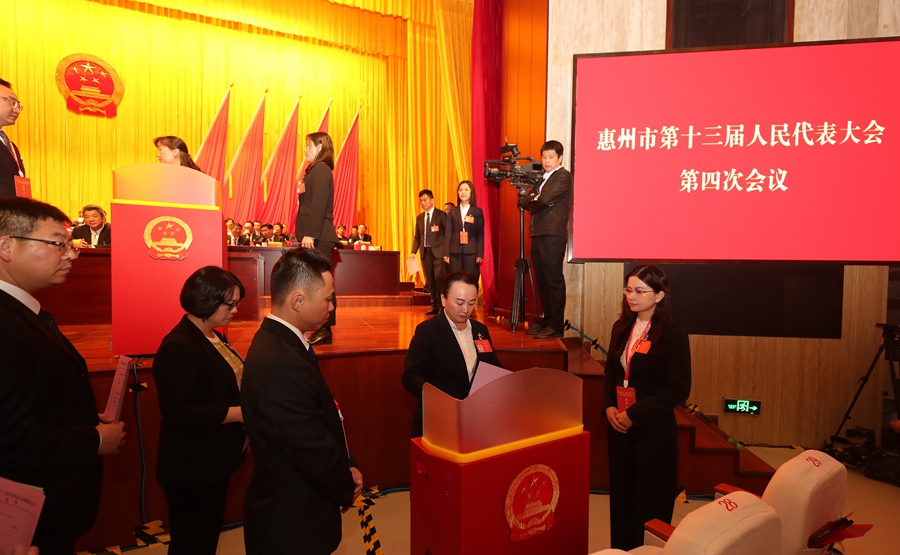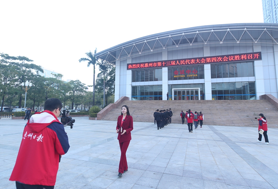 惠州日?qǐng)?bào)記者出鏡報(bào)道市十三屆人大四次會(huì)議開幕。