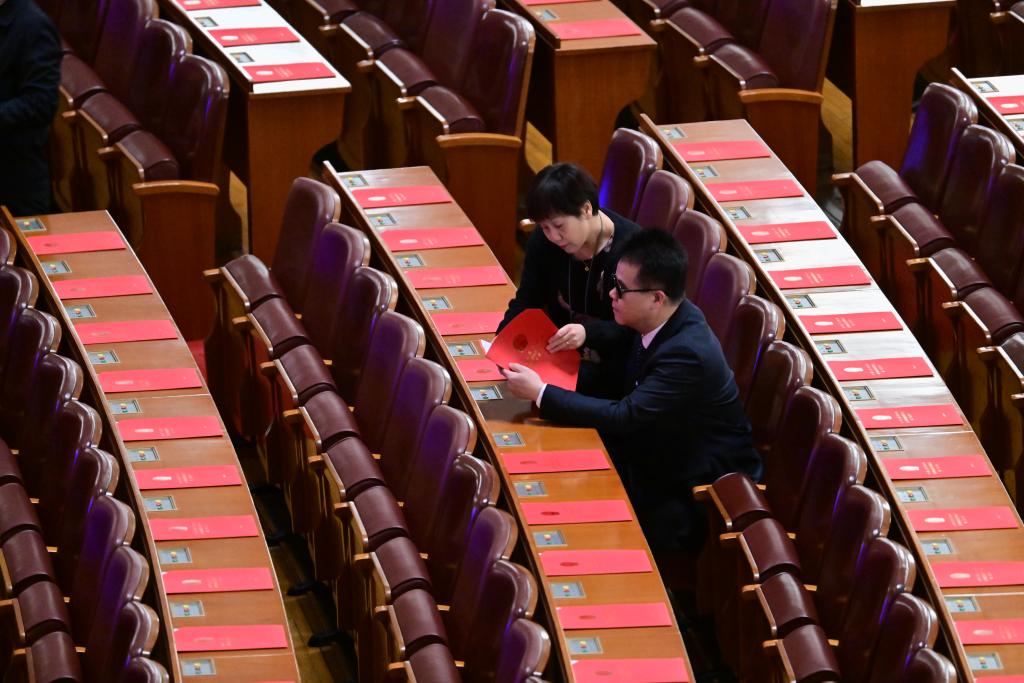 3月11日,第十四屆全國人民代表大會(huì)第二次會(huì)議在北京人民大會(huì)堂舉行閉幕會(huì)。這是閉幕會(huì)開始前,盲人代表王永澄(右)早早來到會(huì)場熟悉大會(huì)材料。