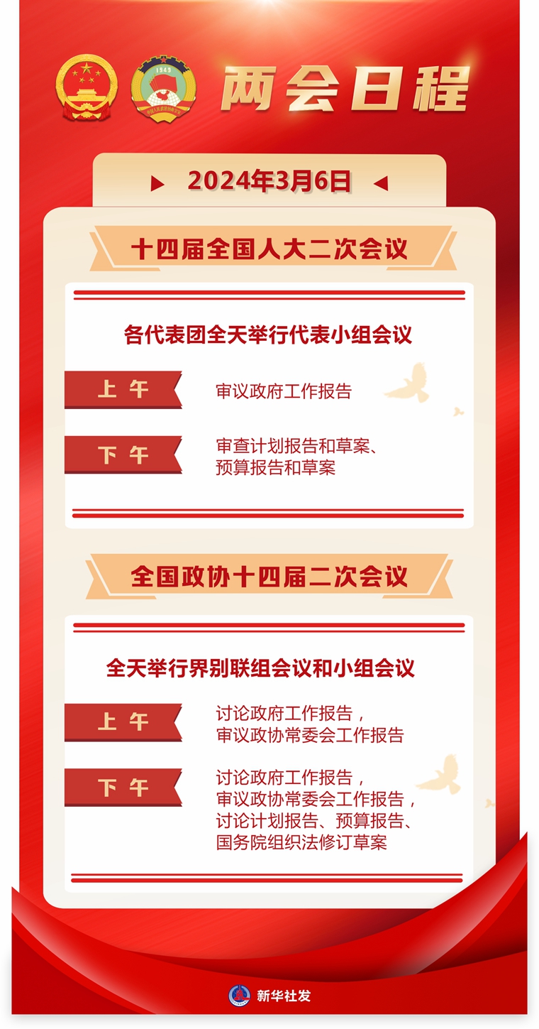 新華社北京3月5日電 十四屆全國人大二次會議各代表團6日全天舉行代表小組會議。上午審議政府工作報告,下午審查計劃報告和草案、預(yù)算報告和草案。