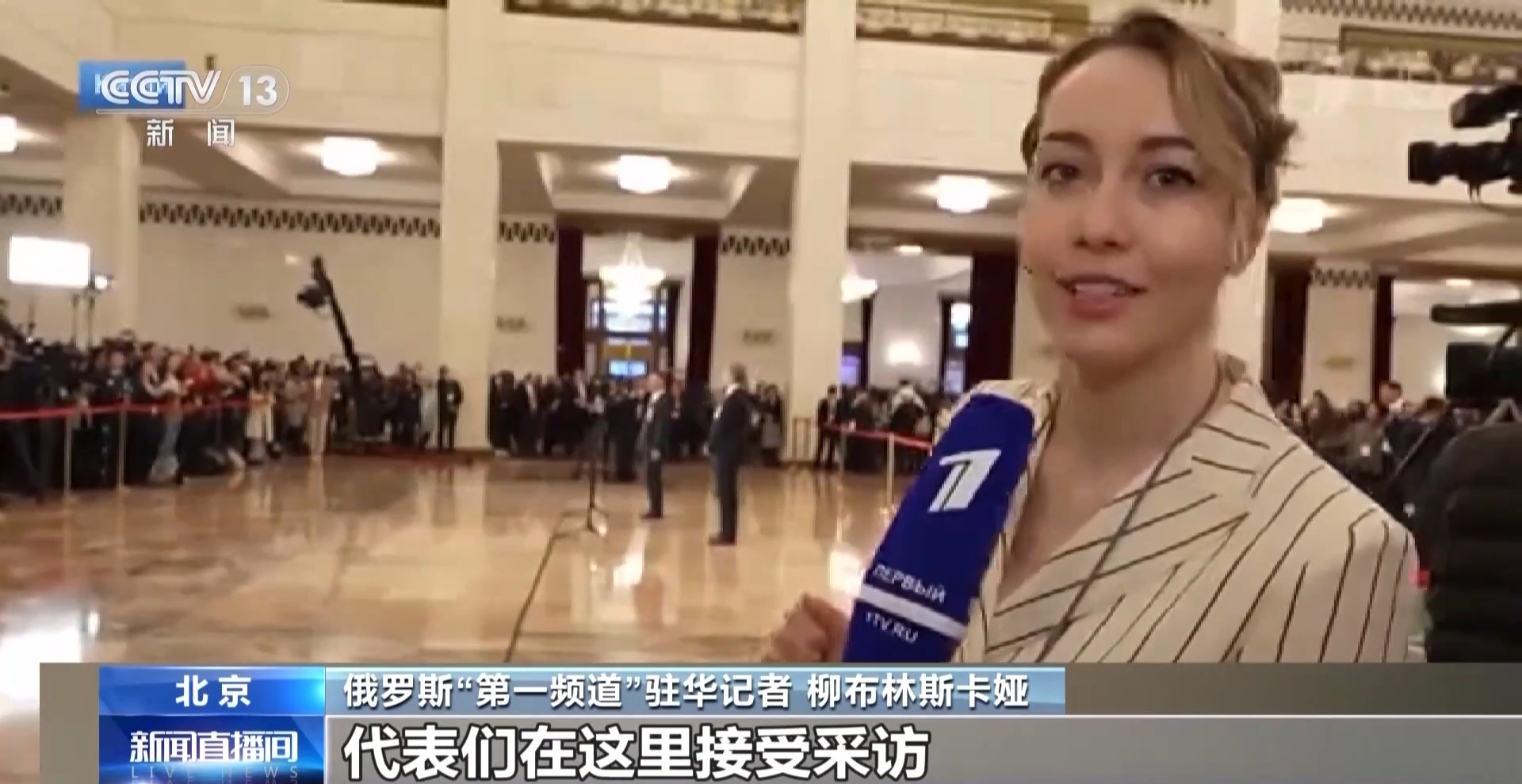 俄羅斯“第一頻道”駐華記者 柳布林斯卡婭:記者太多了,現(xiàn)在記者提問席已經(jīng)排成了一排、兩排、三排、四排、五排、六排。代表們在這里接受采訪,采訪說中文。