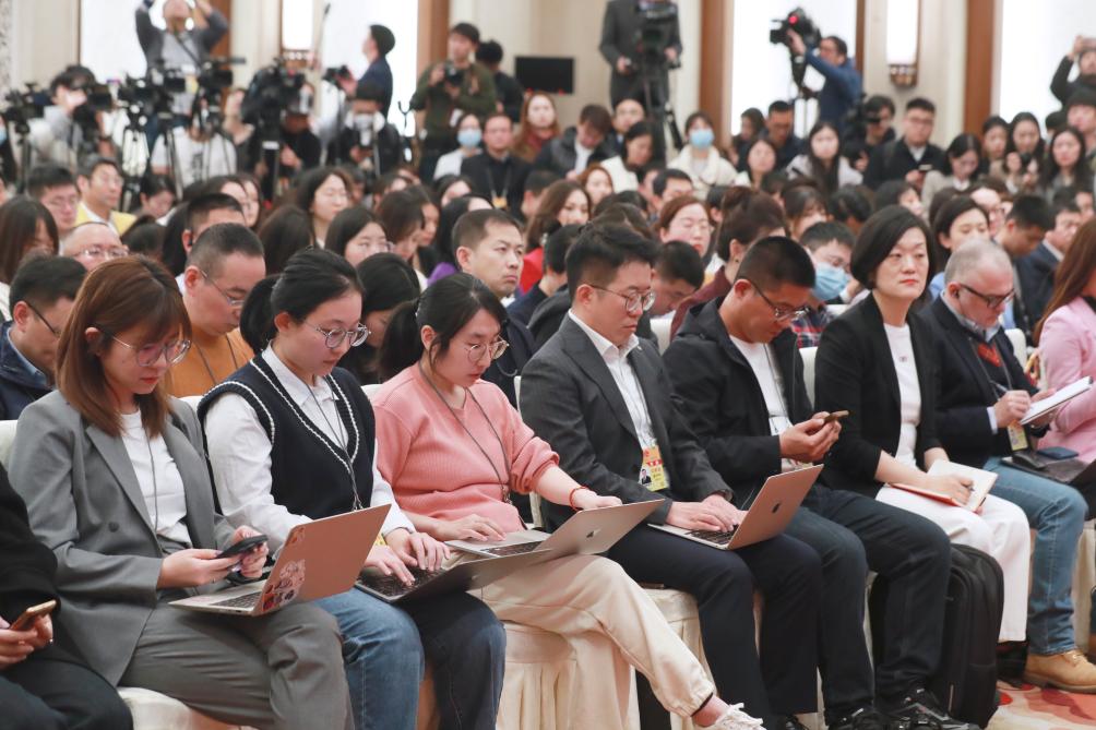 3月4日,十四屆全國(guó)人大二次會(huì)議在北京人民大會(huì)堂舉行新聞發(fā)布會(huì)。大會(huì)發(fā)言人婁勤儉就大會(huì)議程和人大工作相關(guān)問題回答中外記者的提問。這是記者在發(fā)布會(huì)上采訪。