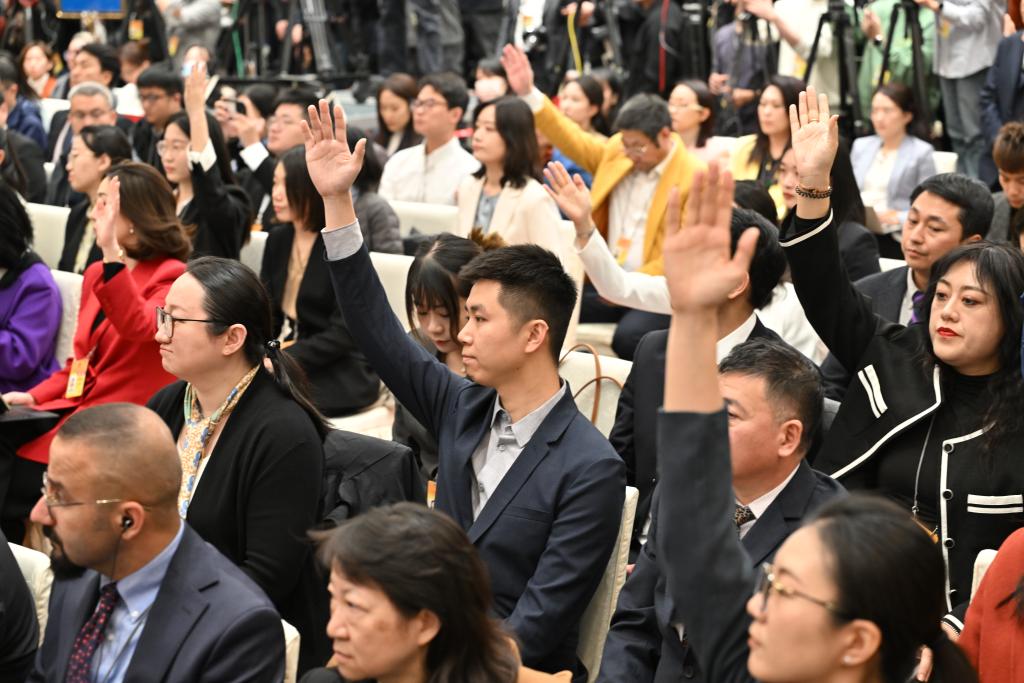 3月4日,十四屆全國(guó)人大二次會(huì)議在北京人民大會(huì)堂舉行新聞發(fā)布會(huì)。大會(huì)發(fā)言人婁勤儉就大會(huì)議程和人大工作相關(guān)問題回答中外記者的提問。這是記者舉手提問。