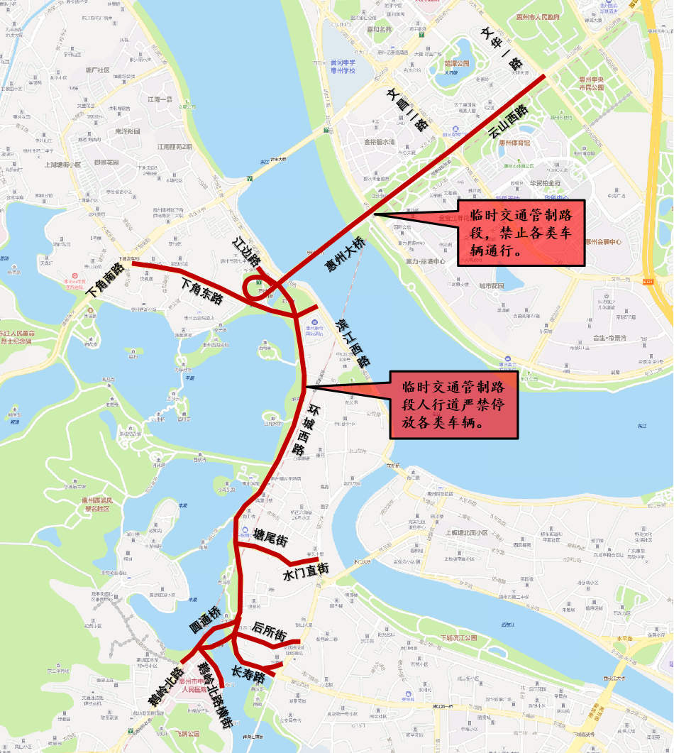 (一)對(duì)云山西路(文華一路至文昌二路路段)、惠州大橋、下角東路、江邊路(下角東路至七中門(mén)口支路路段)、環(huán)城西路、塘尾街、水門(mén)直街、后所街、長(zhǎng)壽路、圓通橋、鵝嶺北路(圓通橋至黃塘路路段)、鵝嶺北路橫街(圓通橋至中心人民醫(yī)院小東門(mén)路段)等路段實(shí)施雙向交通管制,禁止各類(lèi)車(chē)輛通行。