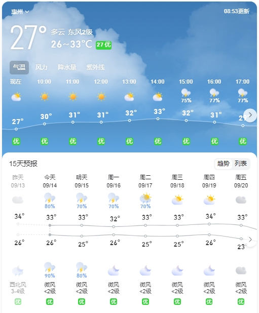 據(jù)惠州市氣象臺(tái)預(yù)計(jì),中秋假期(15-17日)我市天氣陽(yáng)光與雷雨相伴,間中雨勢(shì)較大;中秋夜部分時(shí)段可見(jiàn)月光。