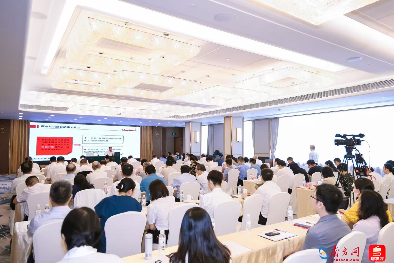 鐘旋輝從深刻認(rèn)識黨的二十屆三中全會的重大意義,深入學(xué)習(xí)領(lǐng)會習(xí)近平總書記在黨的二十屆三中全會上的重要講話精神,全面準(zhǔn)確理解《決定》提出的進一步全面深化改革重大舉措,全面貫徹落實黨的二十屆三中全會各項部署,以走在前列的擔(dān)當(dāng)進一步全面深化改革,扎實推進中國式現(xiàn)代化的廣東實踐等四方面,對三中全會進行全面深入的解讀和宣講。報告內(nèi)容豐富、分析透徹,既有理論的高度,又有實踐的深度。他表示,中國式現(xiàn)代化是在改革開放中不斷推進的,也必將在改革開放中開辟廣闊前景。廣大黨員干部要更加緊密地團結(jié)在以習(xí)近平同志為核心的黨中央周圍,堅持以習(xí)近平新時代中國特色社會主義思想為指導(dǎo),認(rèn)真學(xué)習(xí)貫徹黨的二十屆三中全會精神,深刻領(lǐng)悟“兩個確立”的決定性意義,增強“四個意識”、堅定“四個自信”、做到“兩個維護”,高舉改革開放旗幟,凝心聚力、奮發(fā)進取,為全面建成社會主義現(xiàn)代化強國、實現(xiàn)第二個百年奮斗目標(biāo),以中國式現(xiàn)代化全面推進中華民族偉大復(fù)興而努力奮斗!