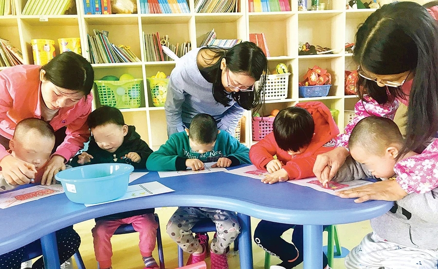 市兒童福利院老師指導(dǎo)孤殘兒童。 惠州東江圖片社供圖