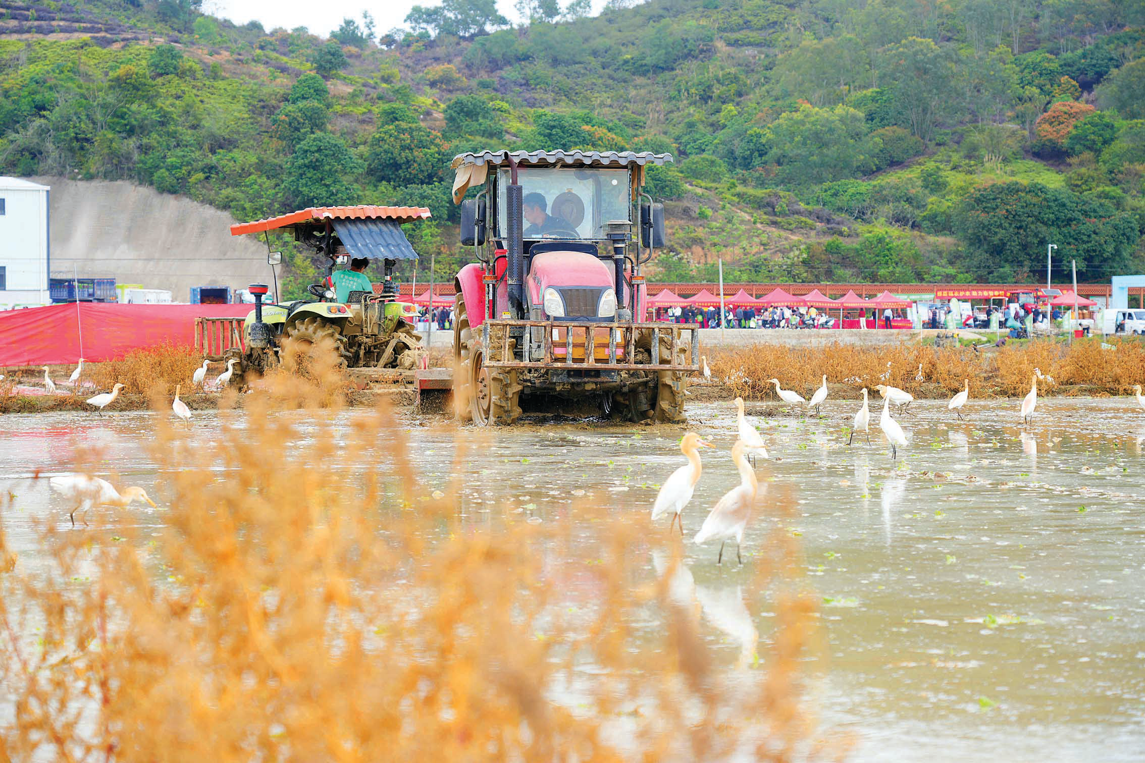 農(nóng)機手駕駛新型農(nóng)機忙著打田,一群白鷺圍著覓食。