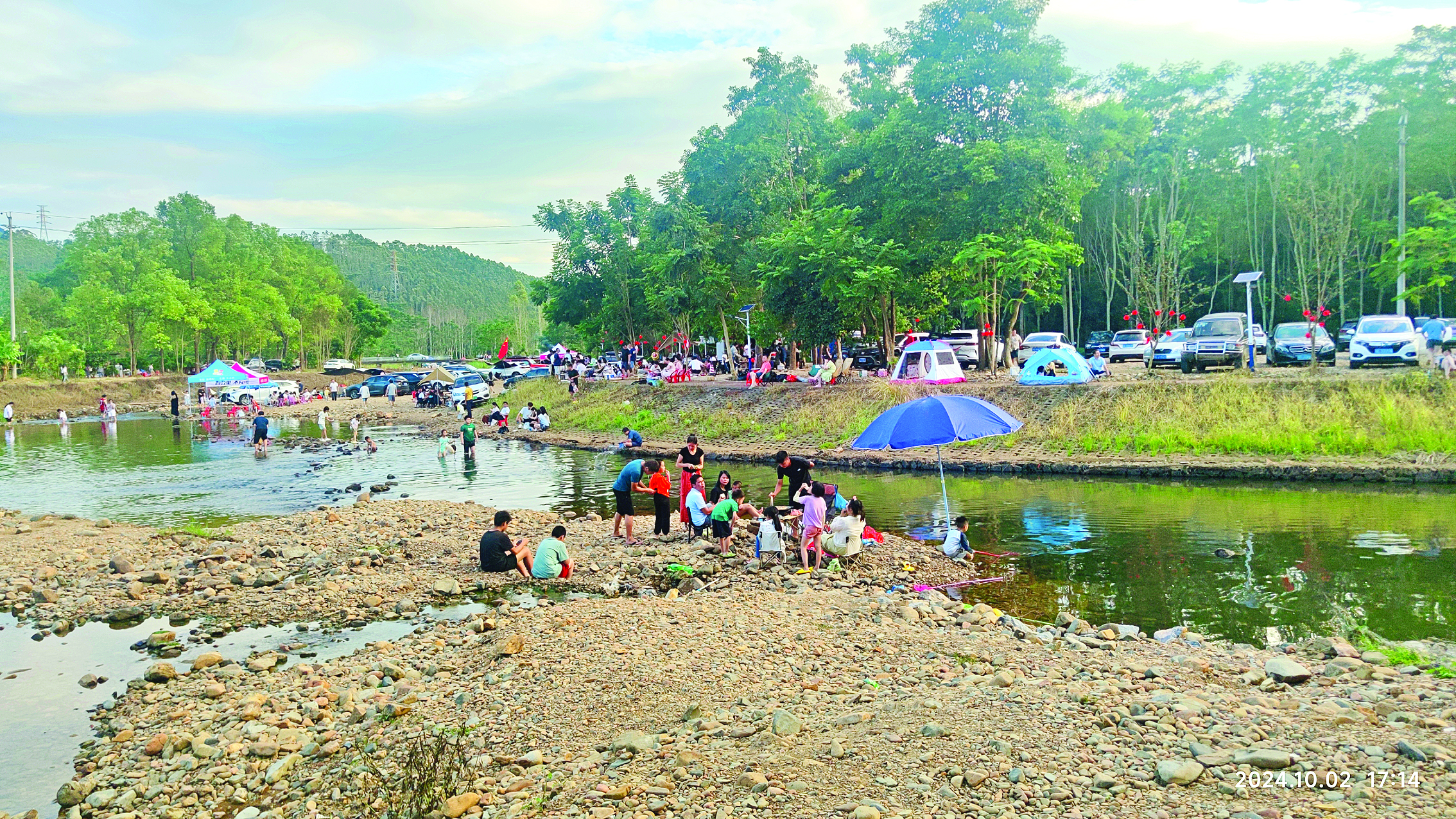 水東陂水藍(lán)坪段(下稱“藍(lán)坪河”),被稱為藍(lán)坪村的母親河,也是公莊河的源頭。藍(lán)坪河全長約4公里,是藍(lán)坪村及下游地區(qū)的灌溉水源。時下初冬時節(jié),水藍(lán)坪段的河水下降了不少,光滑的鵝卵石在水里清晰可見,岸上大小不一的鵝卵石,鋪成了一片天然的石灘地,成為自然饋贈予人們露營的天然好去處。人們只需自帶簡易桌椅、帳篷便可在此擁抱大自然。藍(lán)坪村黨支部書記、村委會主任張國雄說,每到節(jié)假日,藍(lán)坪河岸邊總是熱熱鬧鬧的。