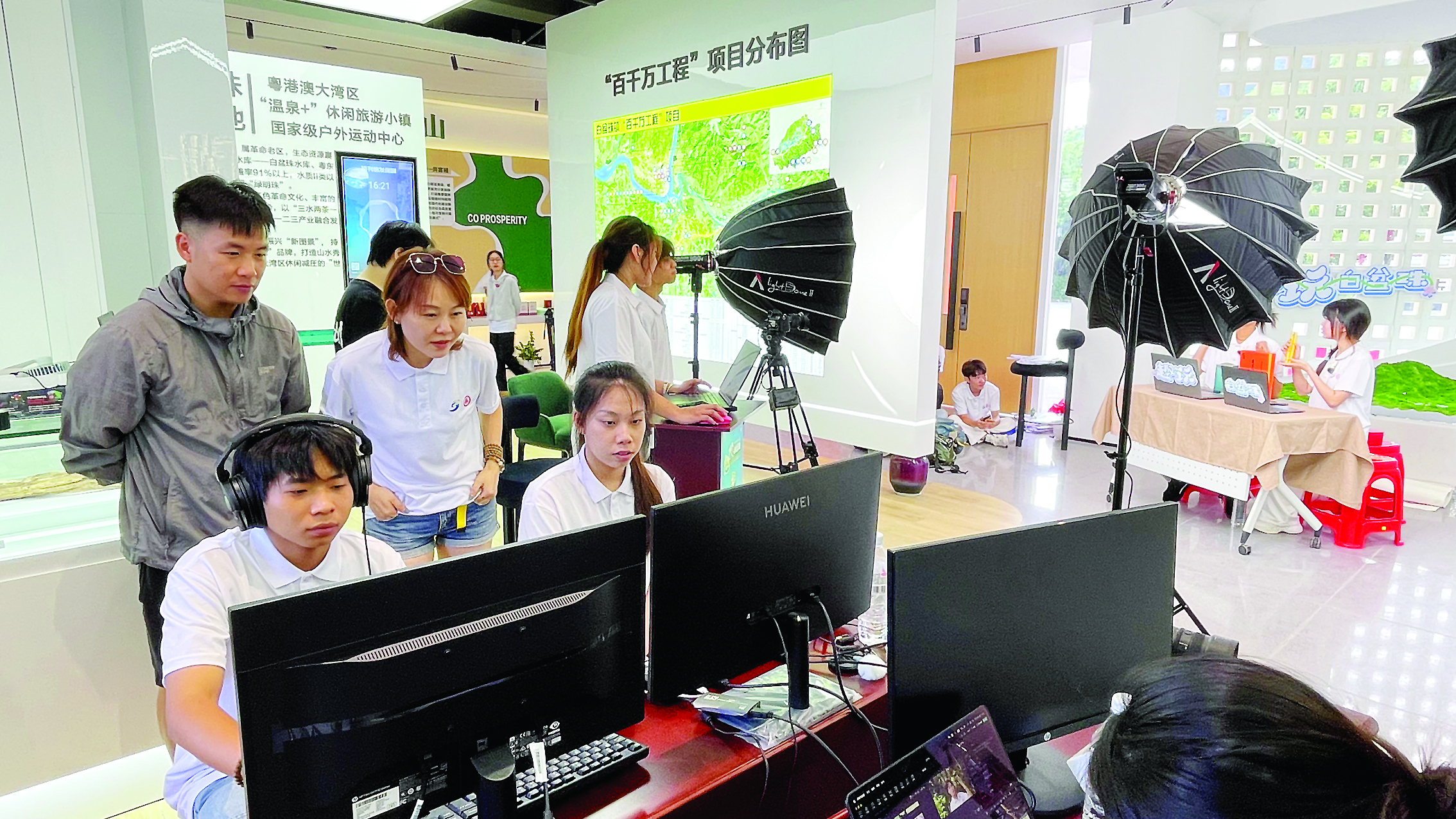 “‘趣’玩白盆珠,點(diǎn)贊深職大!”直播間里傳來一陣陣吶喊聲,原來是“紅金藍(lán)綠”農(nóng)文旅直播突擊隊(duì)正在直播。這支突擊隊(duì)前期對(duì)白盆珠鎮(zhèn)文旅資源進(jìn)行了挖掘分析及實(shí)地走訪,并以大學(xué)生視角選取了有代表性、符合年輕人文旅偏好的特色景點(diǎn)及線路。他們充分結(jié)合影視傳媒的專業(yè)特長,確定了節(jié)目調(diào)性及直播形態(tài),通過現(xiàn)場(chǎng)直播推廣白盆珠鎮(zhèn)特色景點(diǎn),宣傳當(dāng)?shù)剞r(nóng)特產(chǎn)品,取得明顯成效。